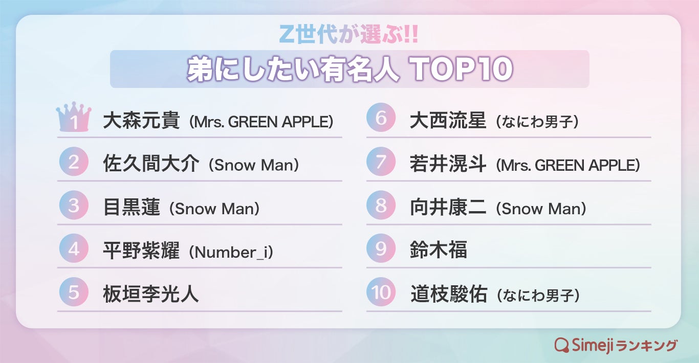 今回のテーマは、3月6日の「弟の日」にちなんだZ世代が選ぶ!!「弟にしたい有名人TOP10」