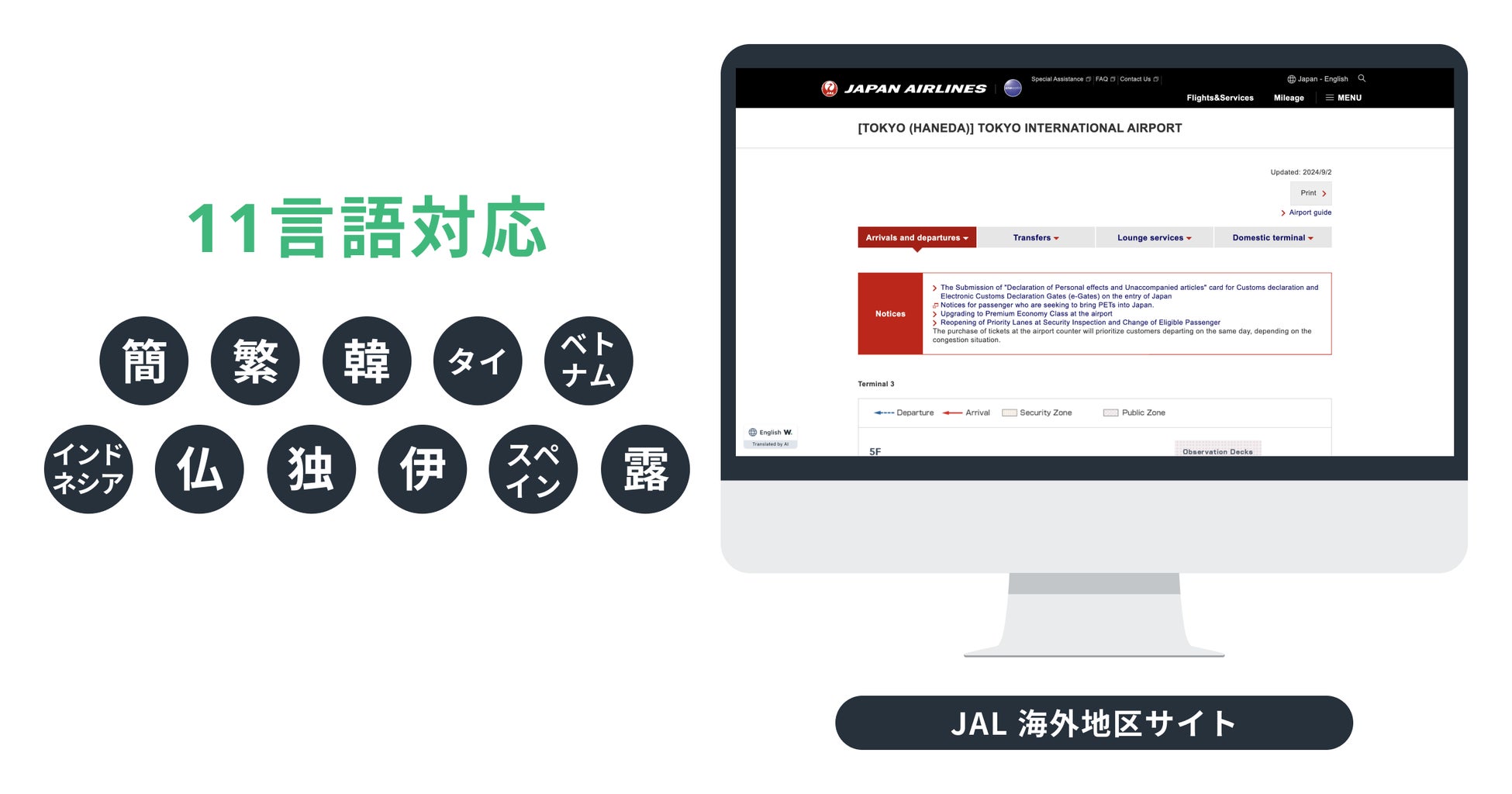 JAL 海外地区向けサイト内の一部のページを、WOVN.io で11言語に対応しています。