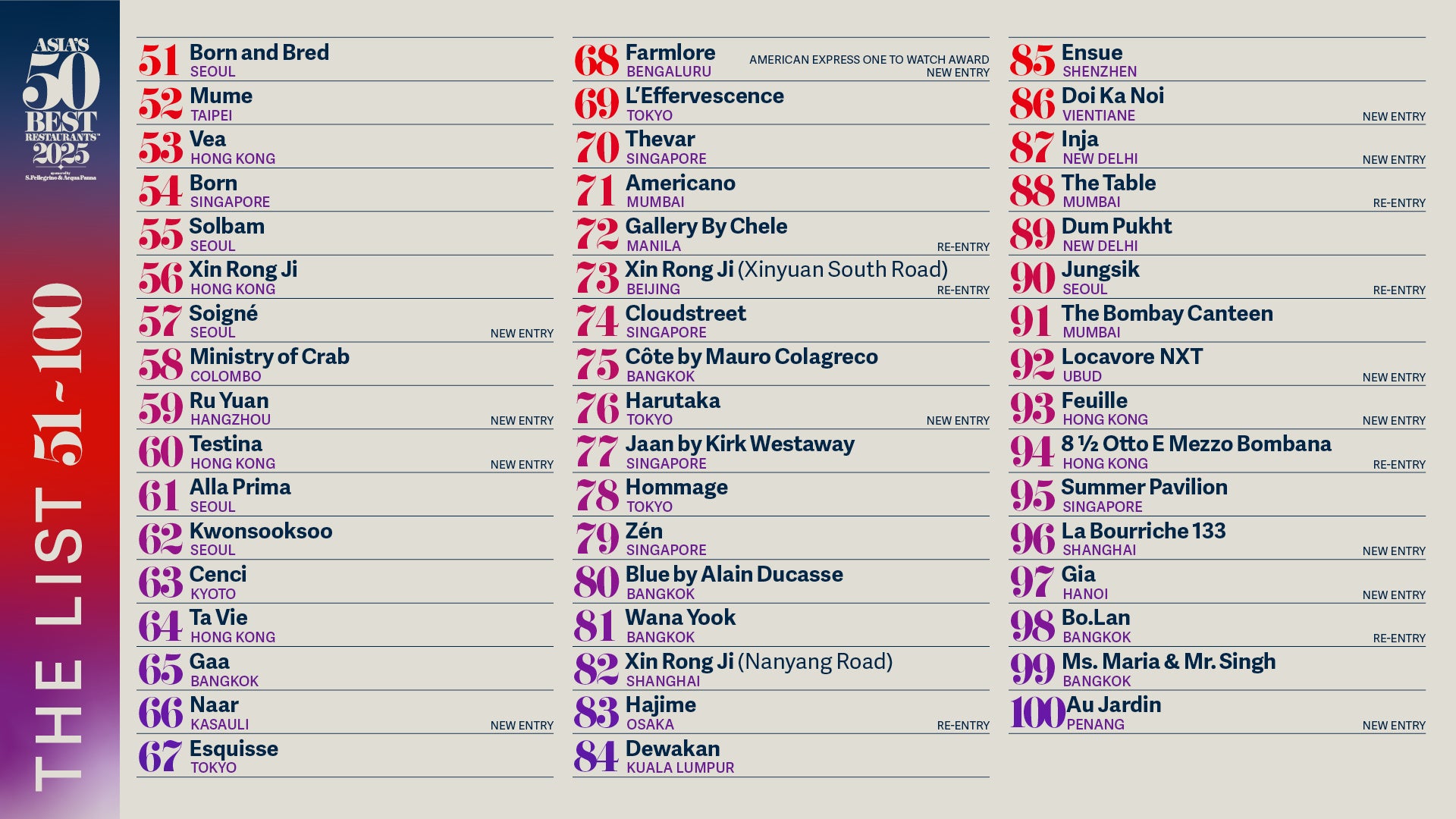 S.Pellegrino (サンペレグリノ) とAcqua Panna(アクアパンナ) が冠スポンサーを務める、アジアのベスト50レストラン (Asia’s 50 Best Restaurants) は本日、2025年度の授賞式の開催に先立ち、51-100位にランクインしたレストランのリストを発表しました。このリストは、影響力のあるフードライター、グルメ評論家、シェフ、レストラン経営者、料理専門家など合計350名以上のジェンダーバランスの取れたメンバーから構成される、Asia’s 50 Best Restaurants Academy (アジアのベスト50レストラン評議委員会)の投票により決定されるものです。
