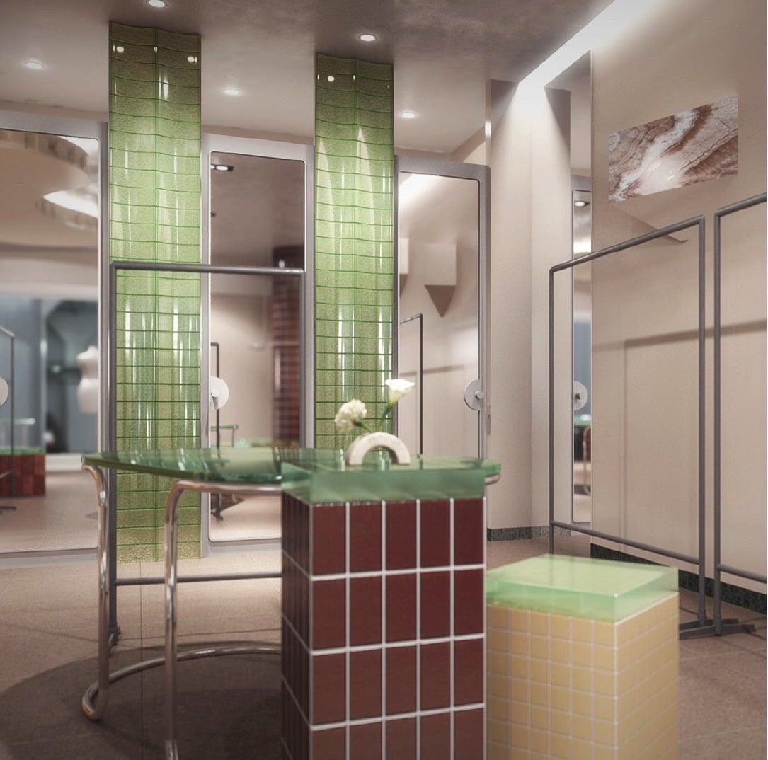 店内のシンボリックな円柱には、廃棄されたガラスを粉砕・再形成して作られた再生ガラスブロックを使用。光を柔らかく透過するデザインは、洗練された透明感を演出するとともに、持続可能な未来へのメッセージを込めています。