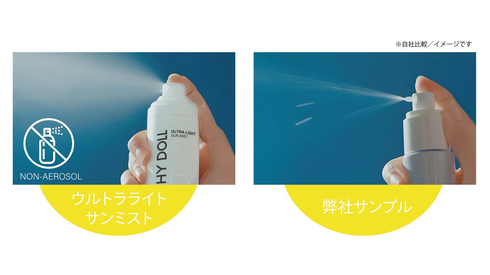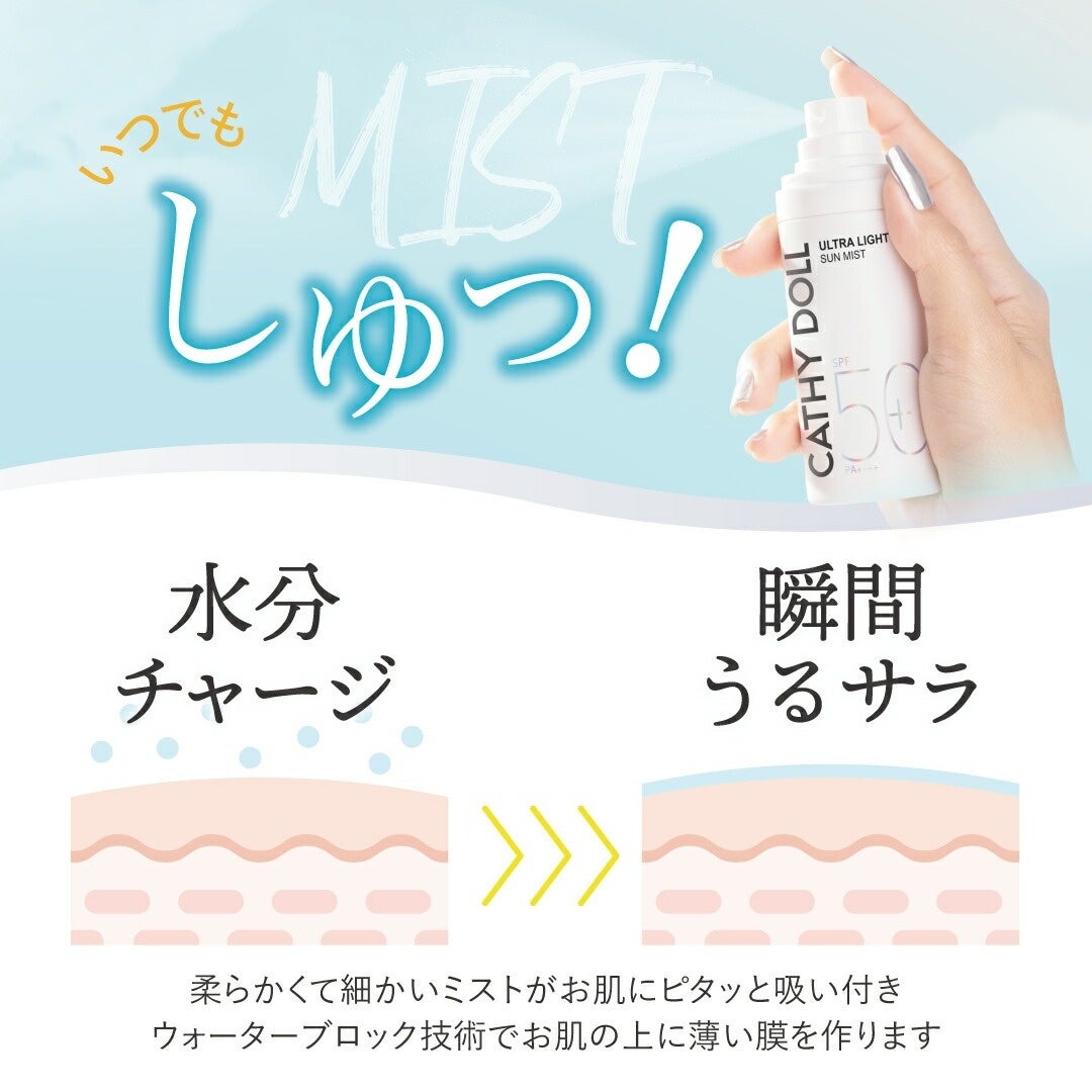 また同シリーズから、手軽に紫外線対策ができるミストタイプの日焼け止め「Cathy Doll ウルトラライト サンミスト」が同日発売となります。セラミドコンプレックス*¹ と、さらさらオイルイン処方*² で紫外線対策をしながらうるおいを与え、なめらかな肌へ整える日焼け止めスプレー。塗り直しにも使いやすく、サンフルイドとの併用がおすすめです。