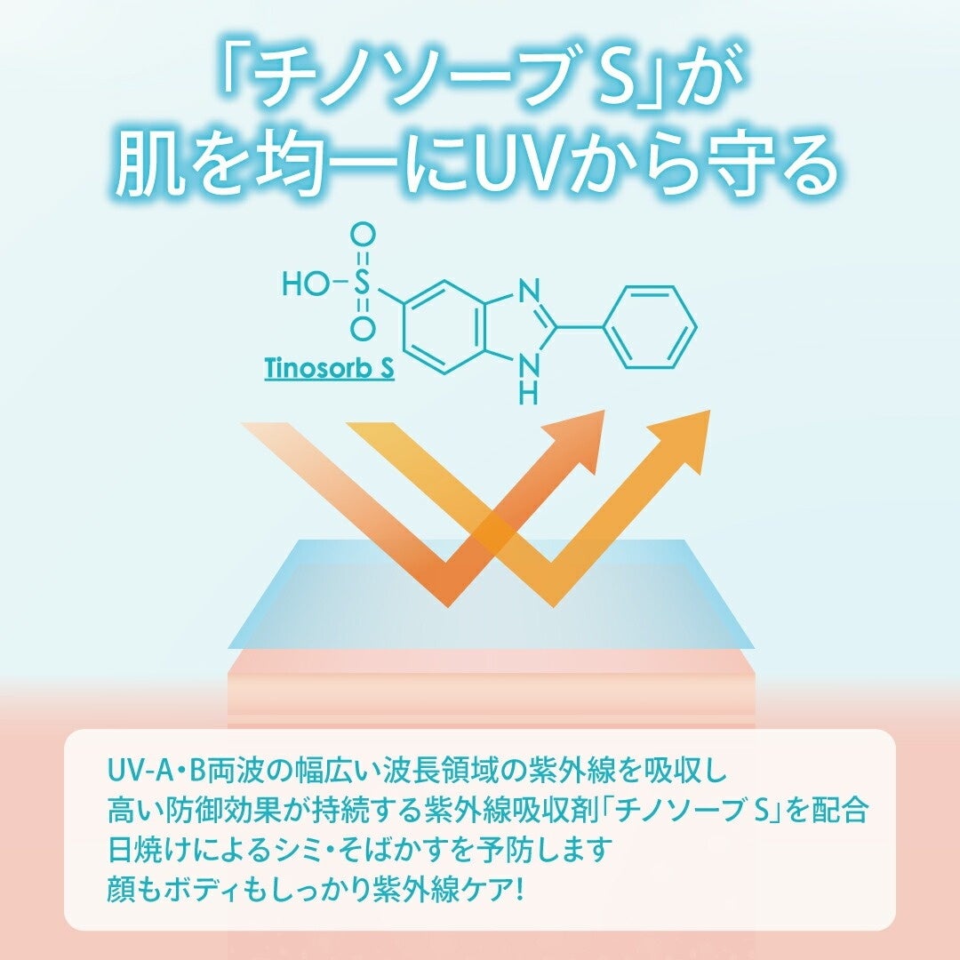 UV-A・B両波の幅広い波長領域の紫外線を吸収し、高い防御効果が持続する紫外線吸収剤「チノソーブ S」を配合。日焼けによるシミ・そばかすを予防します。