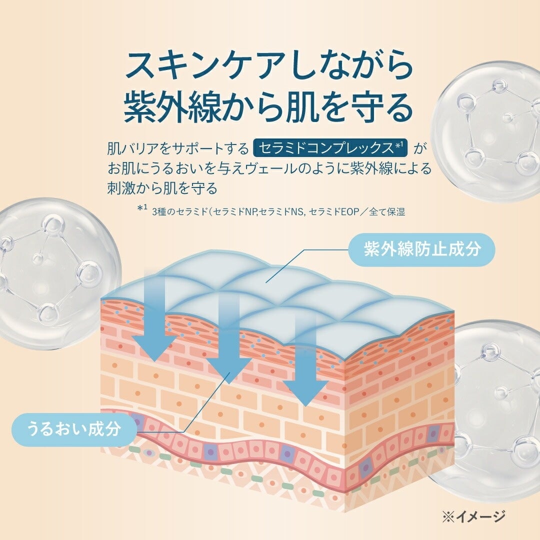 肌バリアをサポートするセラミドコンプレックス*¹がお肌にうるおいを与え、ヴェールのように紫外線による刺激から肌を守ります。