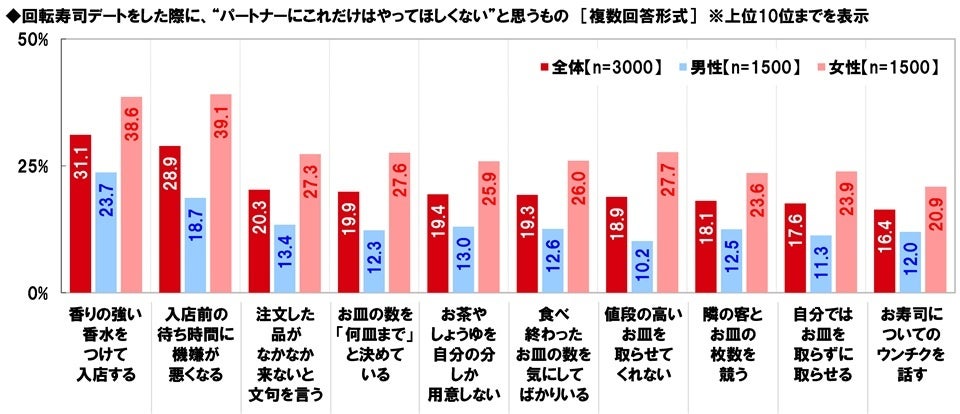 全回答者(3,000名)に、回転寿司デートをした際に、“パートナーにこれだけはやってほしくない”と思うものを聞いたところ、「香りの強い香水をつけて入店する」(31.1%)が最も高くなりました。飲食店でのマナーに対して敏感な人が多いようです。次いで、「入店前の待ち時間に機嫌が悪くなる」(28.9%)、「注文した品がなかなか来ないと文句を言う」(20.3%)、「お皿の数を“何皿まで”と決めている」(19.9%)、「お茶やしょうゆを自分の分しか用意しない」(19.4%)となりました。