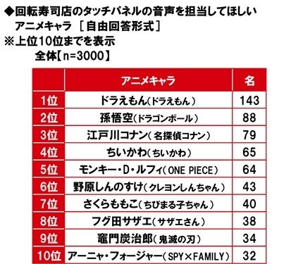 また、回転寿司店のタッチパネルの音声を担当してほしいアニメキャラを聞いたところ、1位「ドラえもん-ドラえもん-」(143名)、2位「孫悟空-ドラゴンボール-」(88名)、3位「江戸川コナン-名探偵コナン-」(79名)、4位「ちいかわ-ちいかわ-」(65名)、5位「モンキー・D・ルフィ-ONE PIECE-」(64名)となりました。