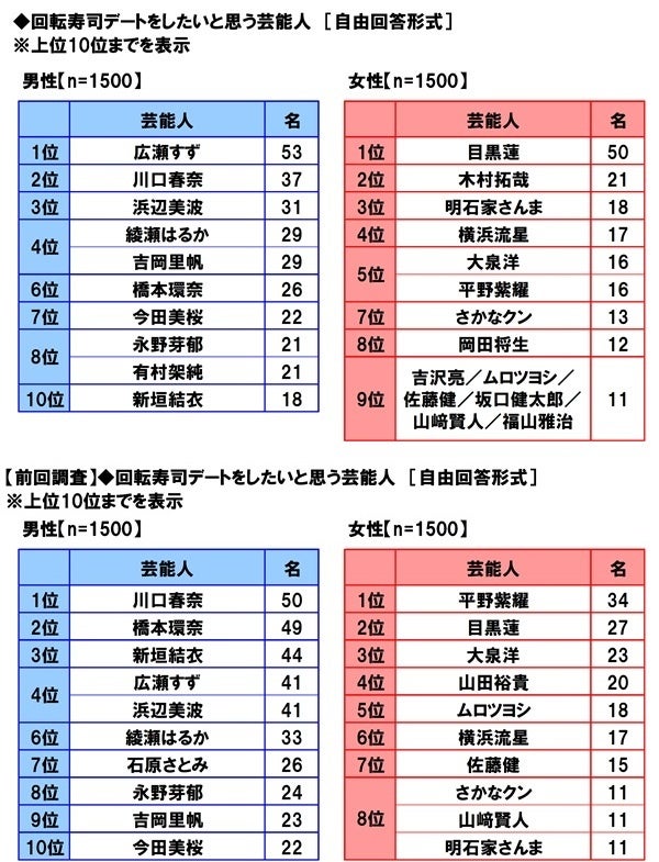 回転寿司デートをしたい芸能人 男性回答1位「広瀬すずさん」、女性回答1位「目黒蓮さん」