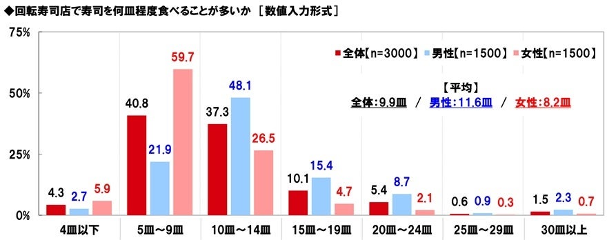回転寿司店で食べる皿数 男性は平均11.6皿、女性は平均8.2皿