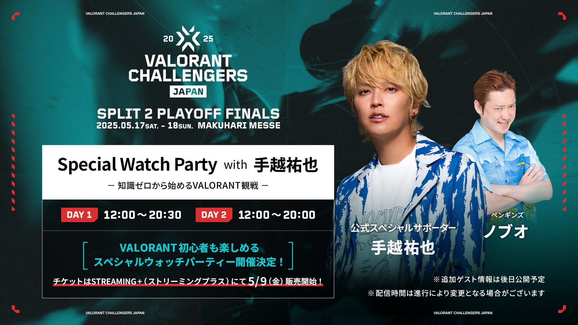 VALORANT Challengers Japan 2025実行委員会は、5月17日(土)、18日(日)に幕張メッセで開催する、ライアットゲームズが開発・運営するタクティカルFPSゲーム「VALORANT」の日本最大級のeスポーツ大会「VALORANT Challengers Japan 2025」のオフラインイベント「VALORANT Challengers Japan 2025 Split 2 Playoff Finals」にて、公式スペシャルサポーターの手越祐也さん、そして手越さんと一緒にYouTubeチャンネルでVALORANTをプレイしているペンギンズのノブオさんが出演する「Special Watch Party」の開催が決定しました。「Special Watch Party」では、VALORANTのルールを知らなくても楽しめるコンテンツを初心者の方でも気軽に楽しめる内容でオンラインにて有料配信します。Special Watch Partyのチケットは5月9日(金)からイープラスにて販売開始いたします。また、Laz(ZETA DIVISION)、mittiii(FENNEL)、ade(Crazy Raccoon)、Biju(MURASH GAMING)の4名をゲストに迎えて開催する「公開WATCH PARTY」も同時に開催することが決定いたしました。「公開WATCH PARTY」は、会場内で開催している様子を配信でも同時にお楽しみいただけます。配信の詳細は決定次第、お知らせいたします。