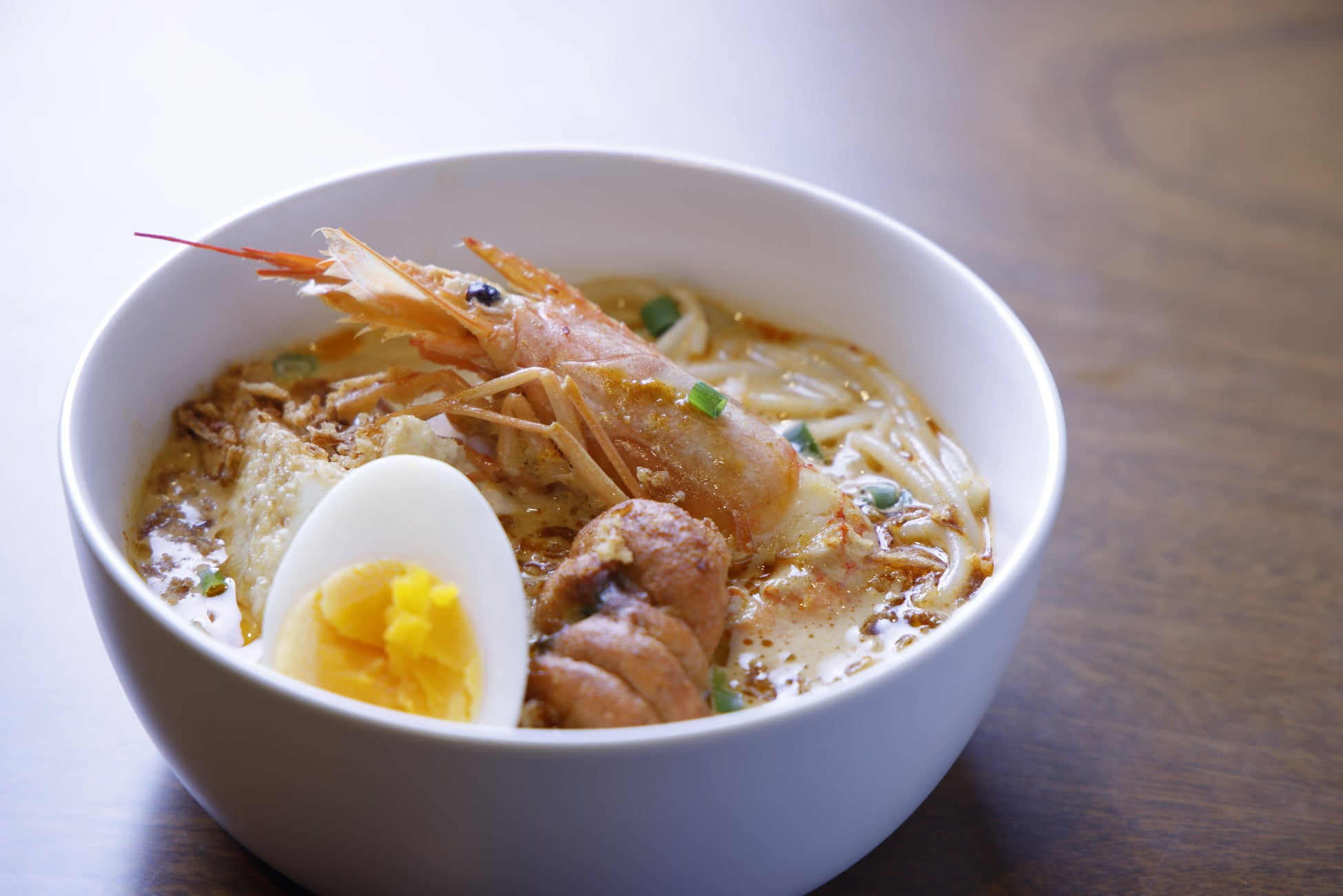 スパイシーな麺料理です。ココナッツミルクと海老の出汁をベースのスープに、自家製の白身魚のフリットやエビ、厚揚げやゆで卵などを加え、香辛料や香草で風味づけされています。甘くまろやかでありながらスパイシーな味が特徴です。