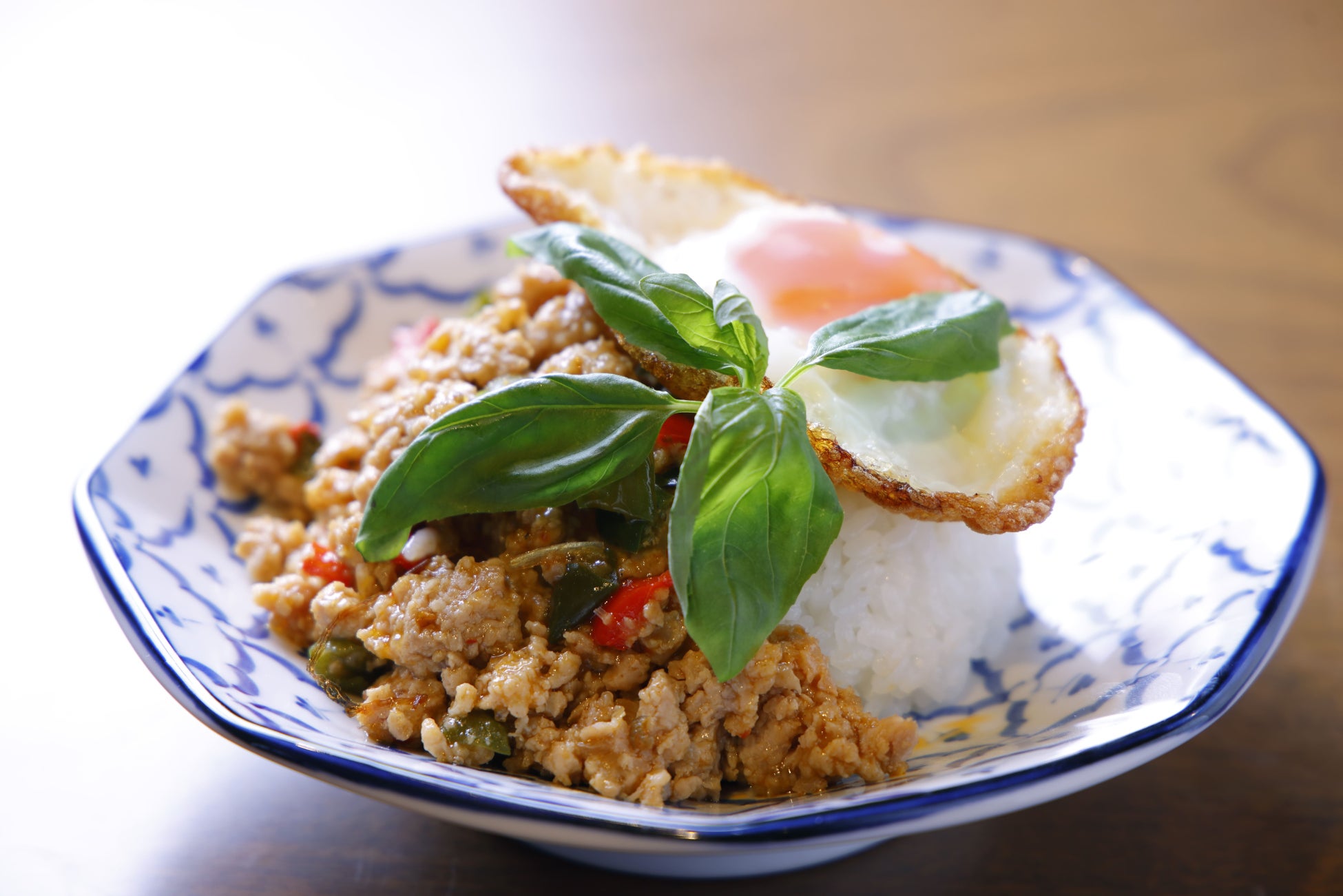 ピリ辛の鶏ひき肉と香り高いバジルが絶妙に絡み合う、タイ発の人気ごはん「ガパオライス」。とろりとした目玉焼きをくずせば、スパイスの刺激とまろやかさが溶け合い、ひと口ごとに食欲をそそります。
