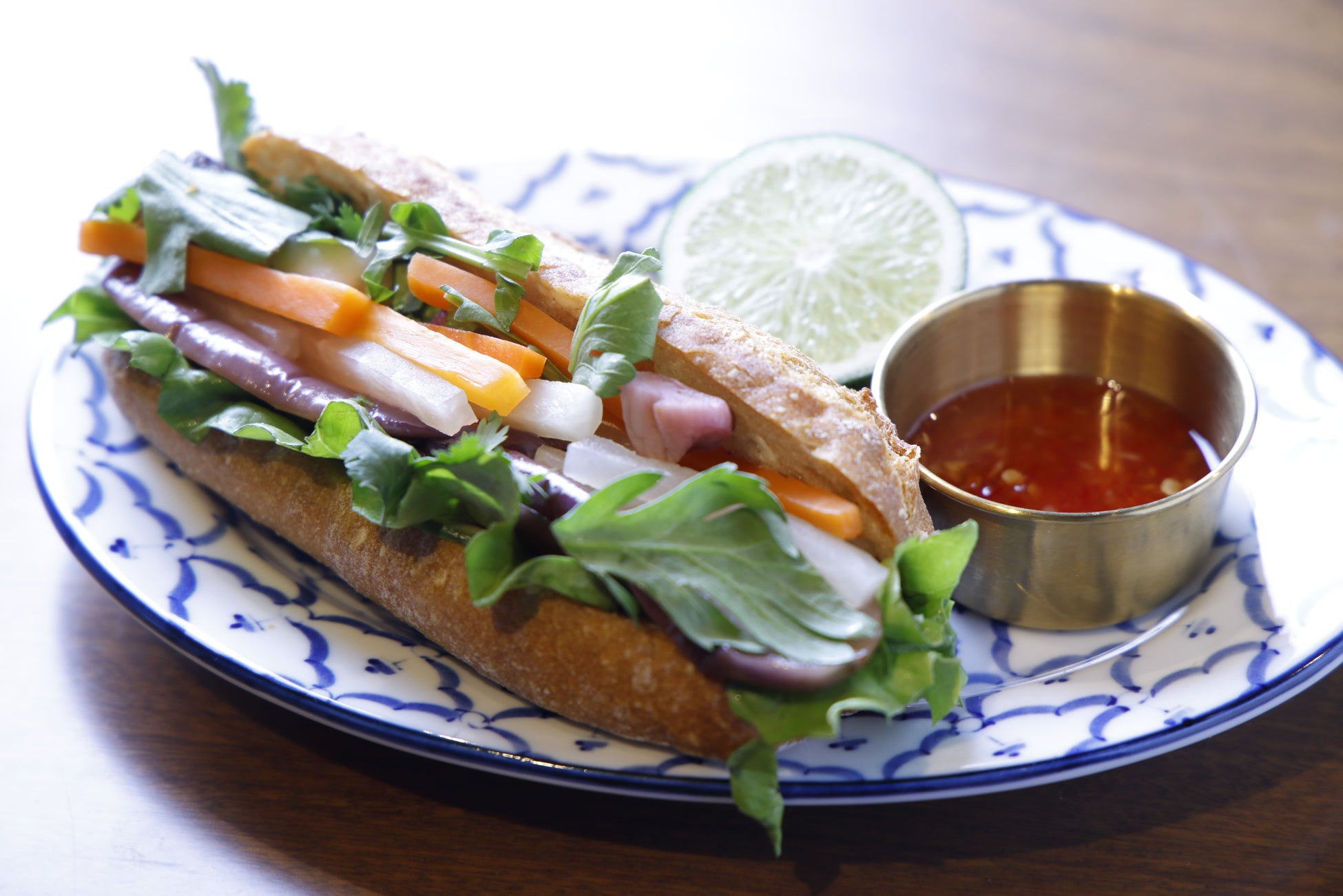ベジタブルバインミーは、歯切れ良いソフトバケットに夏野菜のマリネや新鮮なハーブミックスを甘辛いスイートチリソースマヨネーズ仕上げた。一口で異国の風味が広がります。