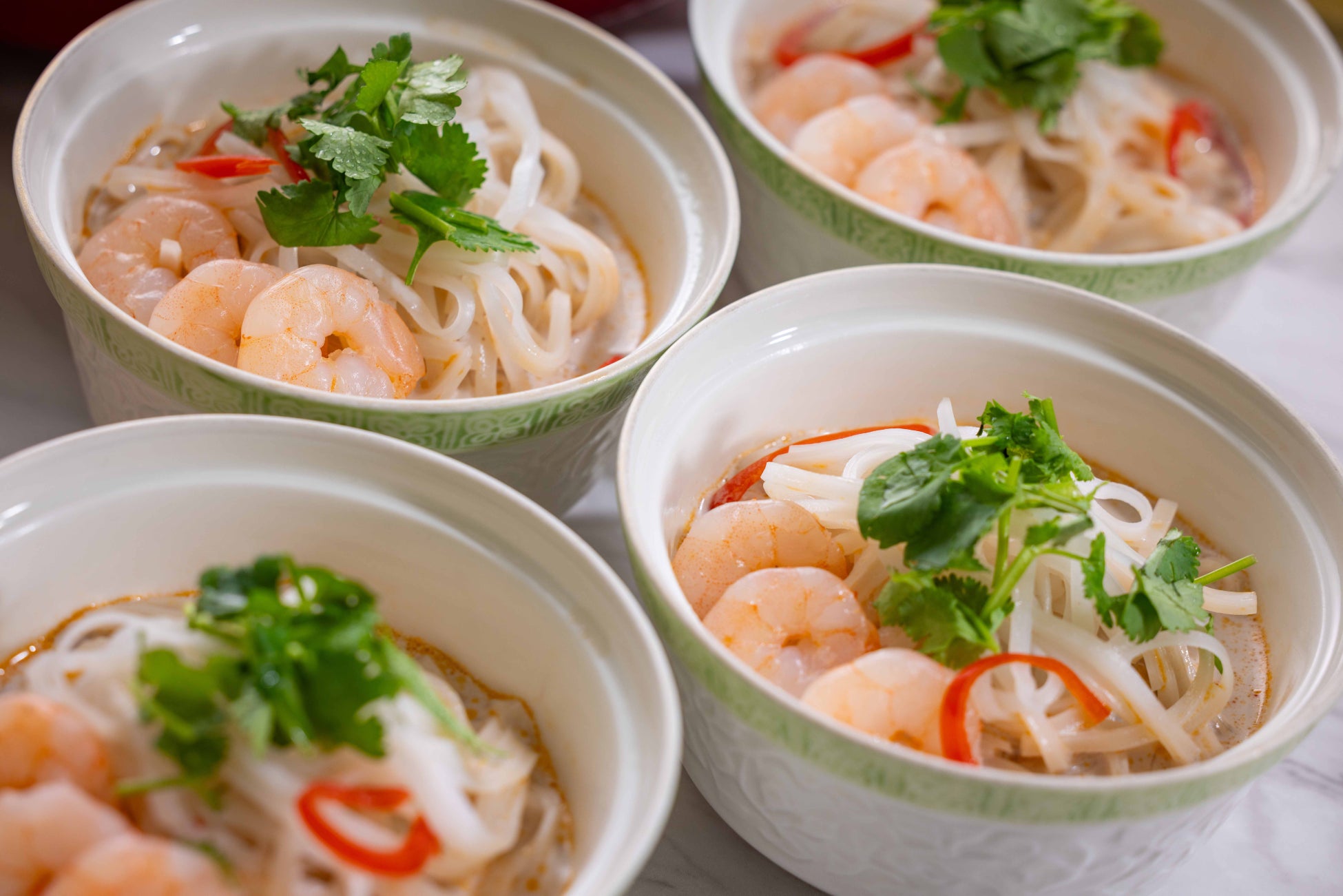 目の前で茹でたてを提供するヌードルステーションのラクサはスパイシーながらもココナッツ風味で優しい味わいです。