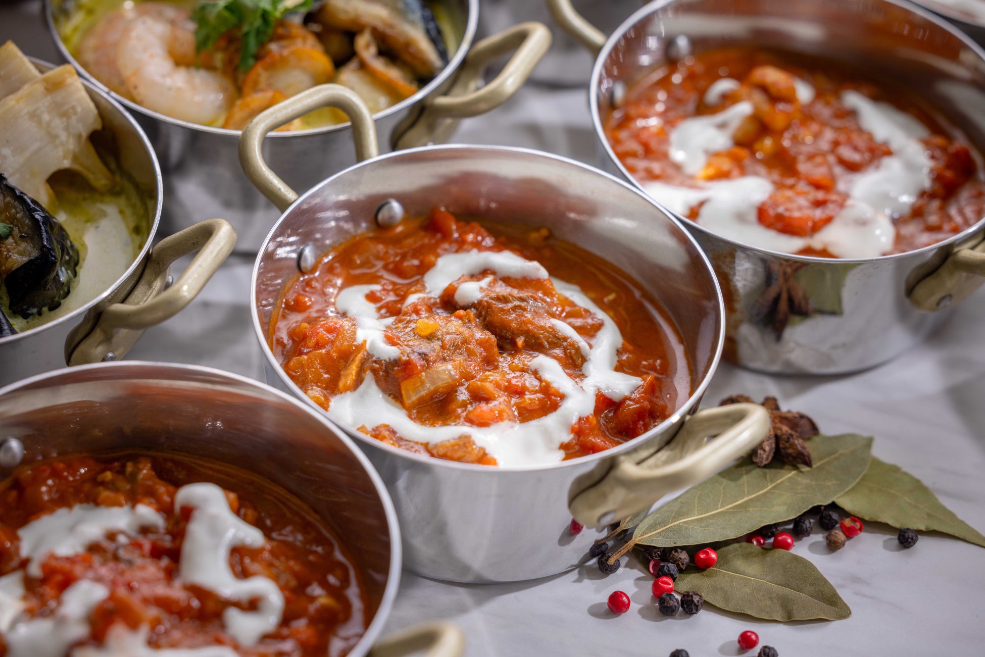 スパイスが効いたシーフードグリーンカレーや、トマトとクリームで煮込んだまろやかな味わいのチキンティッカマサラもナン、ジャスミンライス、パパドと一緒にお愉しみいただけます。