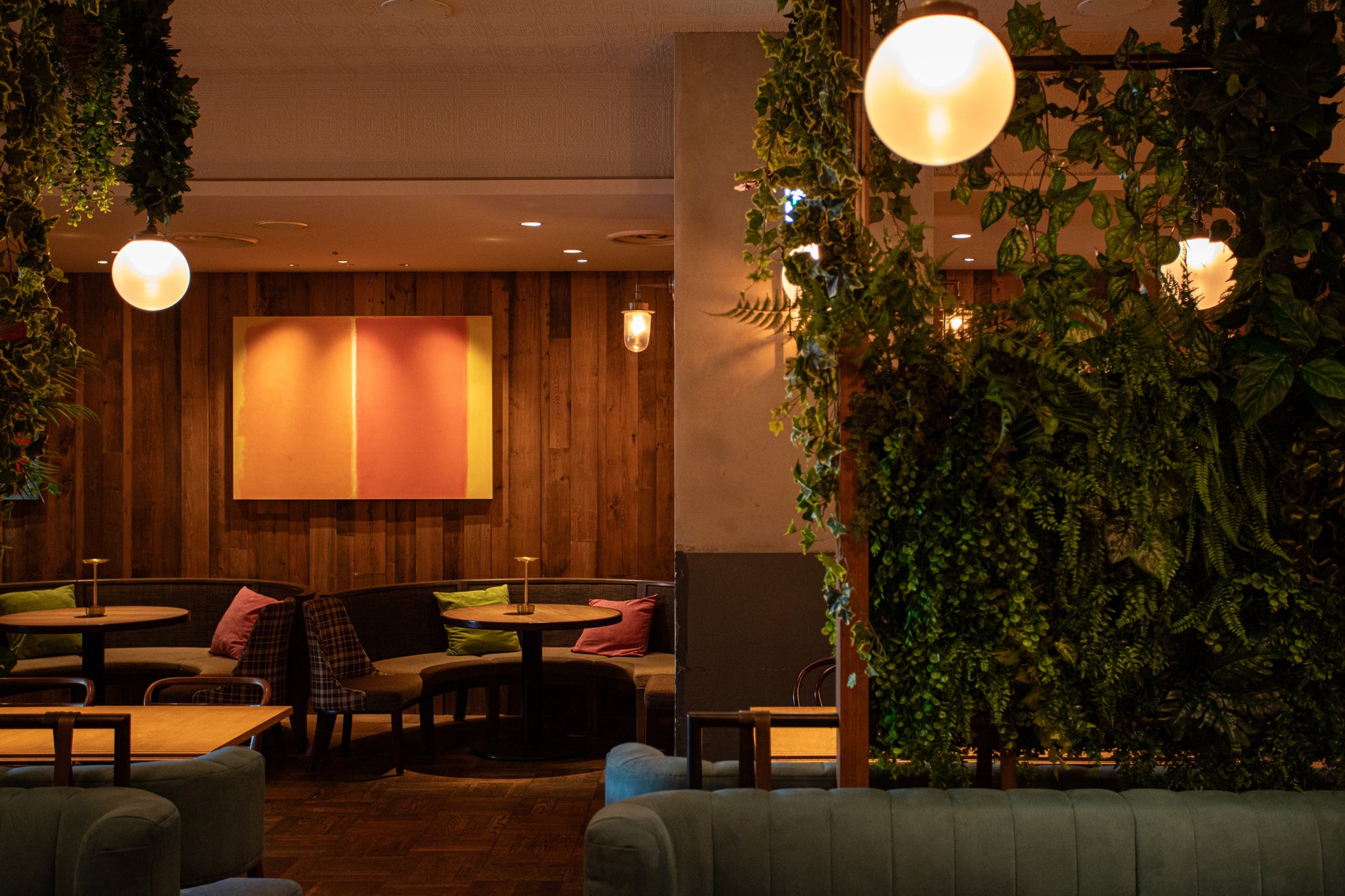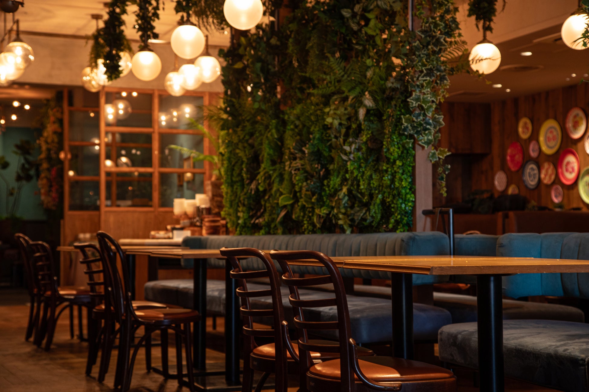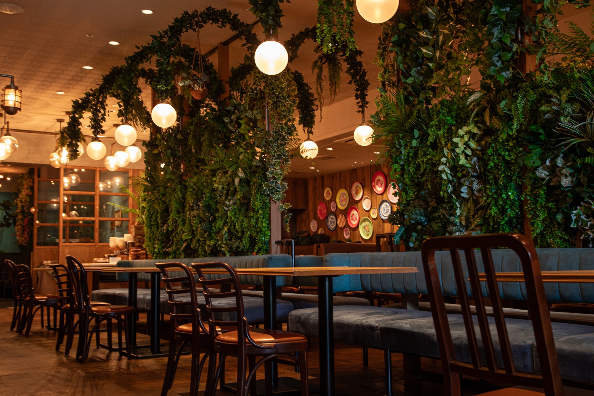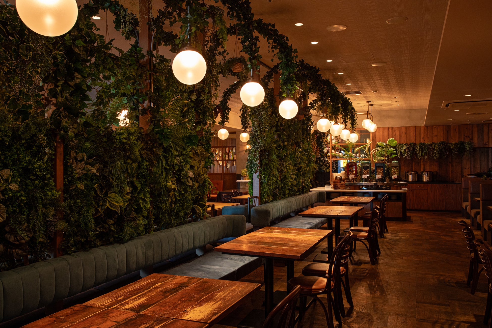 6月18日にグランドオープンした心地よい木漏れ日と瑞々しいグリーンに包まれる「グリーンリゾートエリア」は、都会の喧騒を忘れさせてくれる癒やしの空間。ナチュラルな木材と植物に囲まれたインテリアは、まるでアジアの森の中にいるような感覚に。自然体で過ごせるこの空間は、リラックスしたランチタイムからナチュラル志向の女子会、グループでのカジュアルな飲み会にもぴったり。