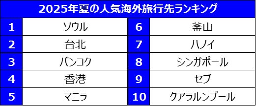 さらに、夏休みの旅行シーズンを前に、Trip.comでは日本人の今夏の人気海外旅行先ランキングを発表いたします。2025年7月20日~9月1日までの期間に予約データによる「2025年夏の人気海外旅行先ランキング」では、1位にソウル、2位に台北、3位にバンコクがランクインしました。海外旅行の予約数の割合は、国内旅行を上回り、アジア地域への人気傾向は引き続き高いことがうかがえます。