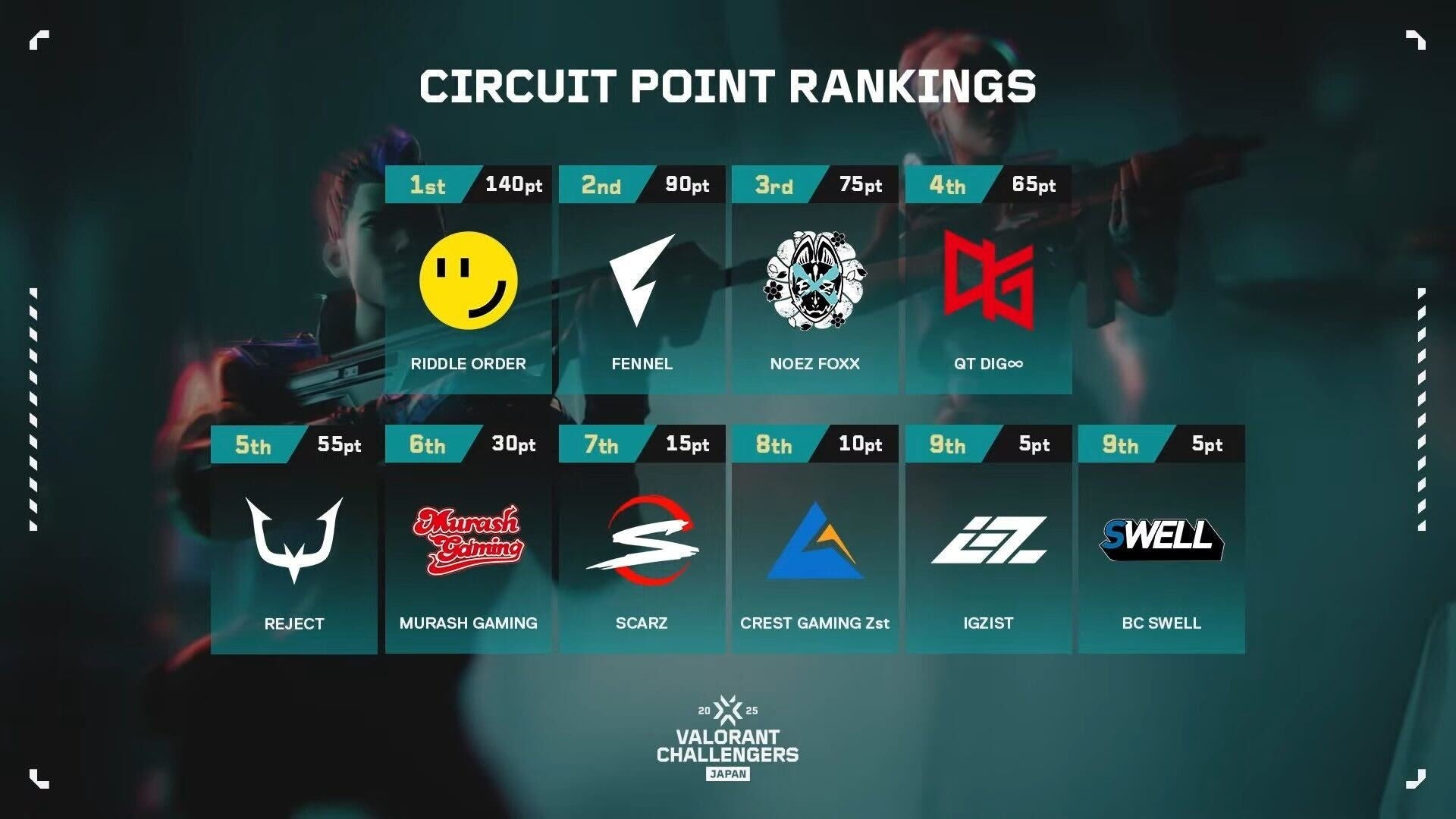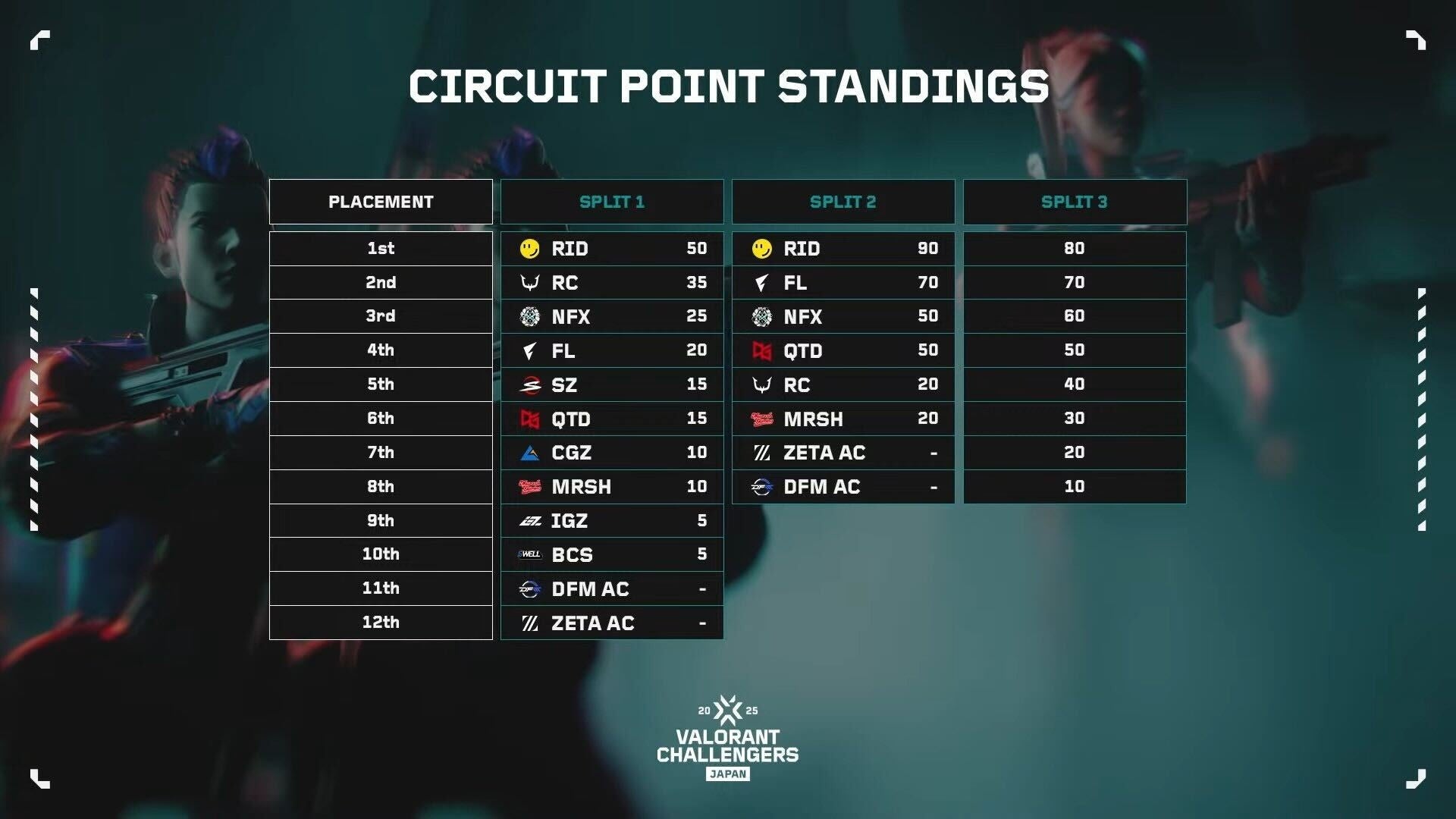 ※RIDDLE ORDERはSplit 2終了時点で、Split 3のサーキットポイントが4位以上になることが確定したため、Season Finalsへの出場が確定