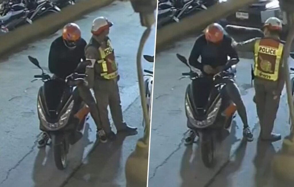 映像では、交通警察官がオートバイ運転手と会話している様子が映されており、その後、運転手が紙幣のようなものを警察官の手に渡す瞬間を確認することができます。