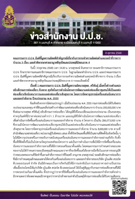 タイ汚職防止委員会(NACC)は、元観光局局長スパン氏と元スポーツ局局長サーンチャン氏の汚職を認定しました。