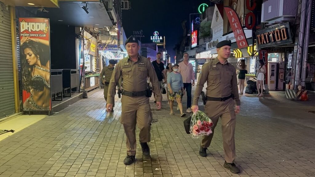 パタヤ警察、ウォーキングストリートで外国人の不法就労と物乞い行為を摘発。