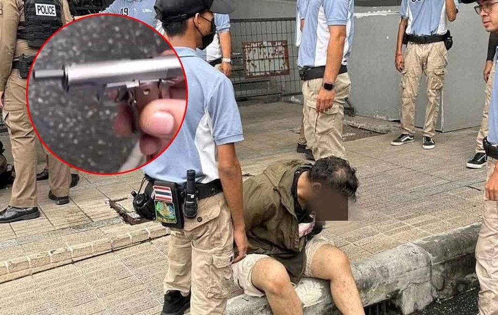 その後、サイアムスクエアの警備スタッフと警察官が駆けつけ、男性を取り押さえて小型銃を押収します。