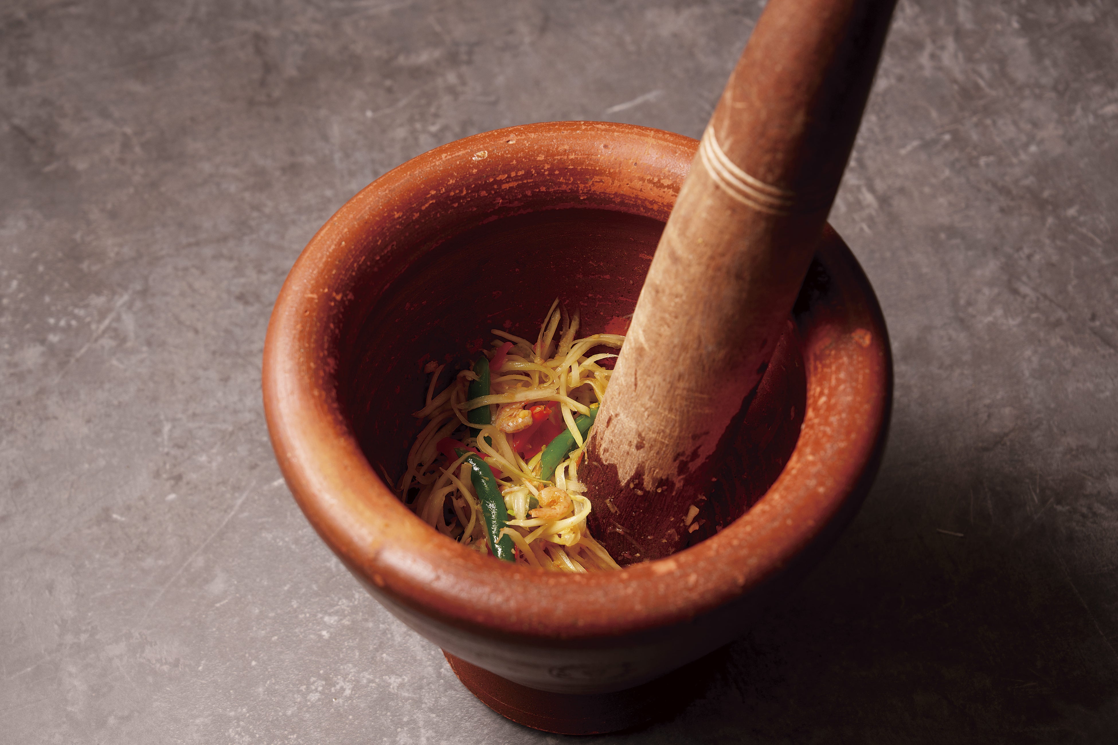 天草産車海老とホタテ貝のヤムウンセン(ヤムウンセン タレー)や本日鮮魚の生春巻きなど、新鮮な素材を活かした彩り豊かな料理を取り揃えております。青パパイヤのサラダ(ソムタム)は、お客さまの目の前でクロックに材料を入れ潰しながら仕上げるライブ感を楽しめます。