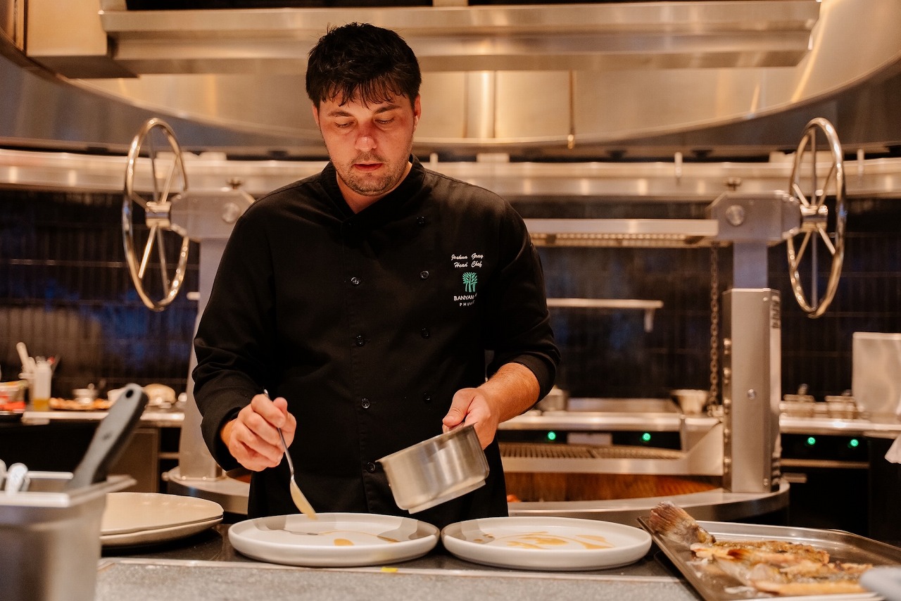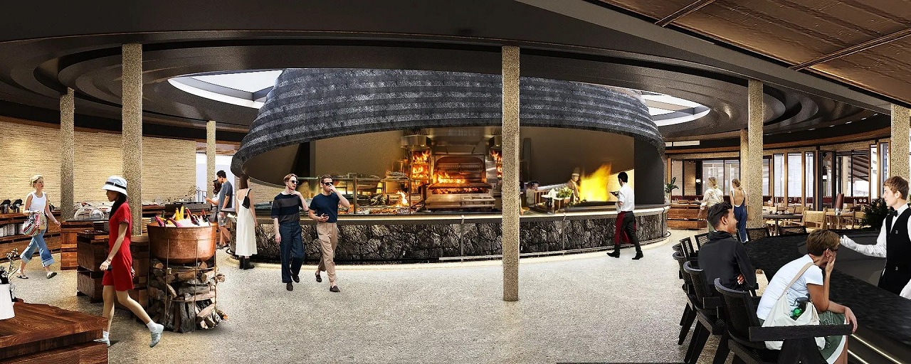 新鮮なシーフードや高級肉をその場でグリルするライブクッキングを体験できるダイニングエリア。