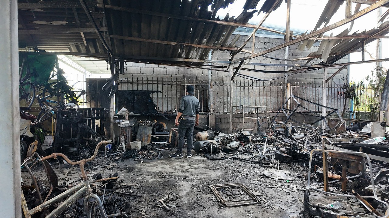 フワイヤイ町消防署が消防車3台を出動させ、約30分後に火は鎮火されましたが、建物全体と修理中のバイク5~6台、ピックアップトラック1台が全焼しました。