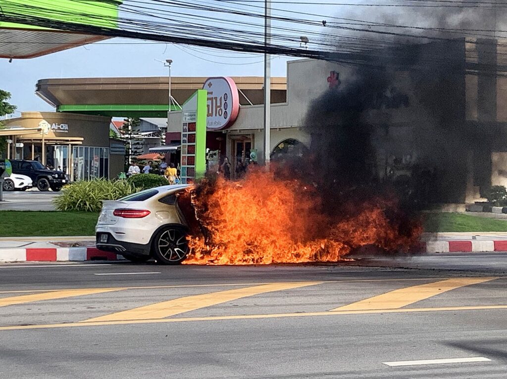 タイ・フアヒンで高級SUVベンツが炎上! 爆発音響く中、店員が救助試みるも全焼。