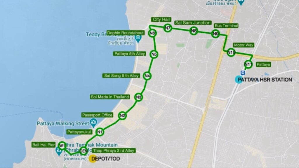 ①グリーンライン:パタヤ駅 – 市街地 – タッププラヤー – バリハイ岬