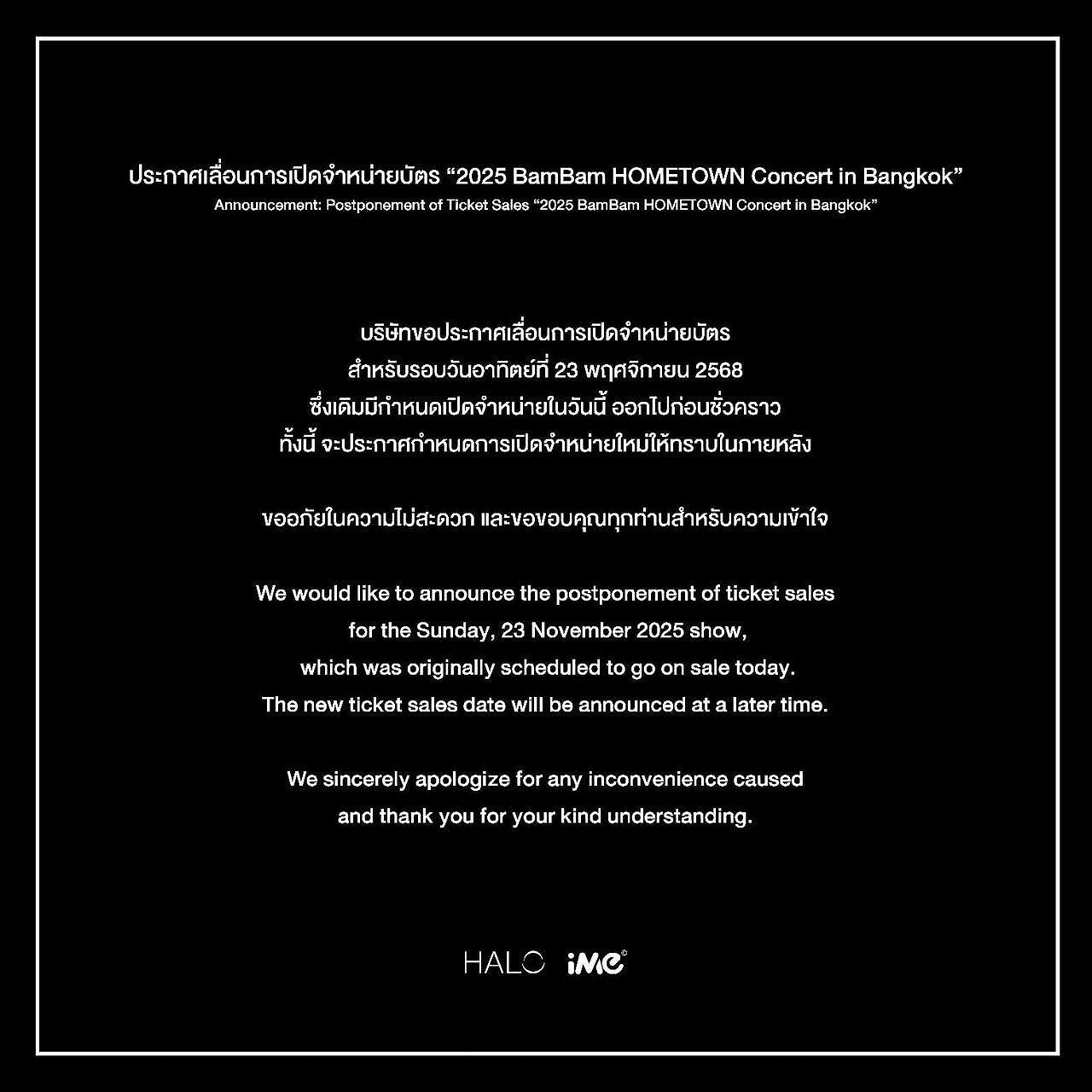 一方、世界的に人気のあるアーティスト BamBamのコンサートを主催する iMe Thailand が、公式SNSを通じて発表を行い、「2025 BamBam HOMETOWN Concert in Bangkok」の 11月23日公演分のチケット販売を一時延期することを明らかにしました。