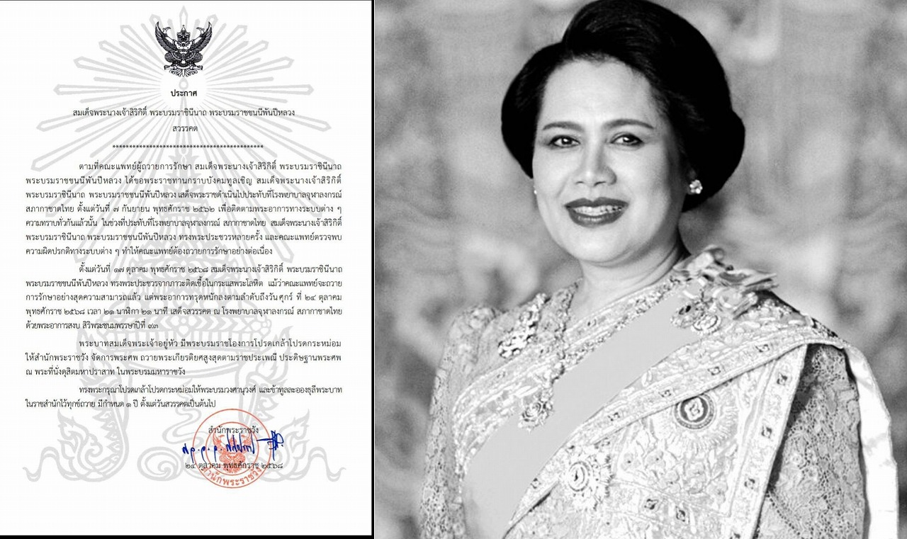 シリキット王太后(正式名:สมเด็จพระนางเจ้าสิริกิติ์ พระบรมราชินีนาถ พระบรมราชชนนีพันปีหลวง)が崩御されました。