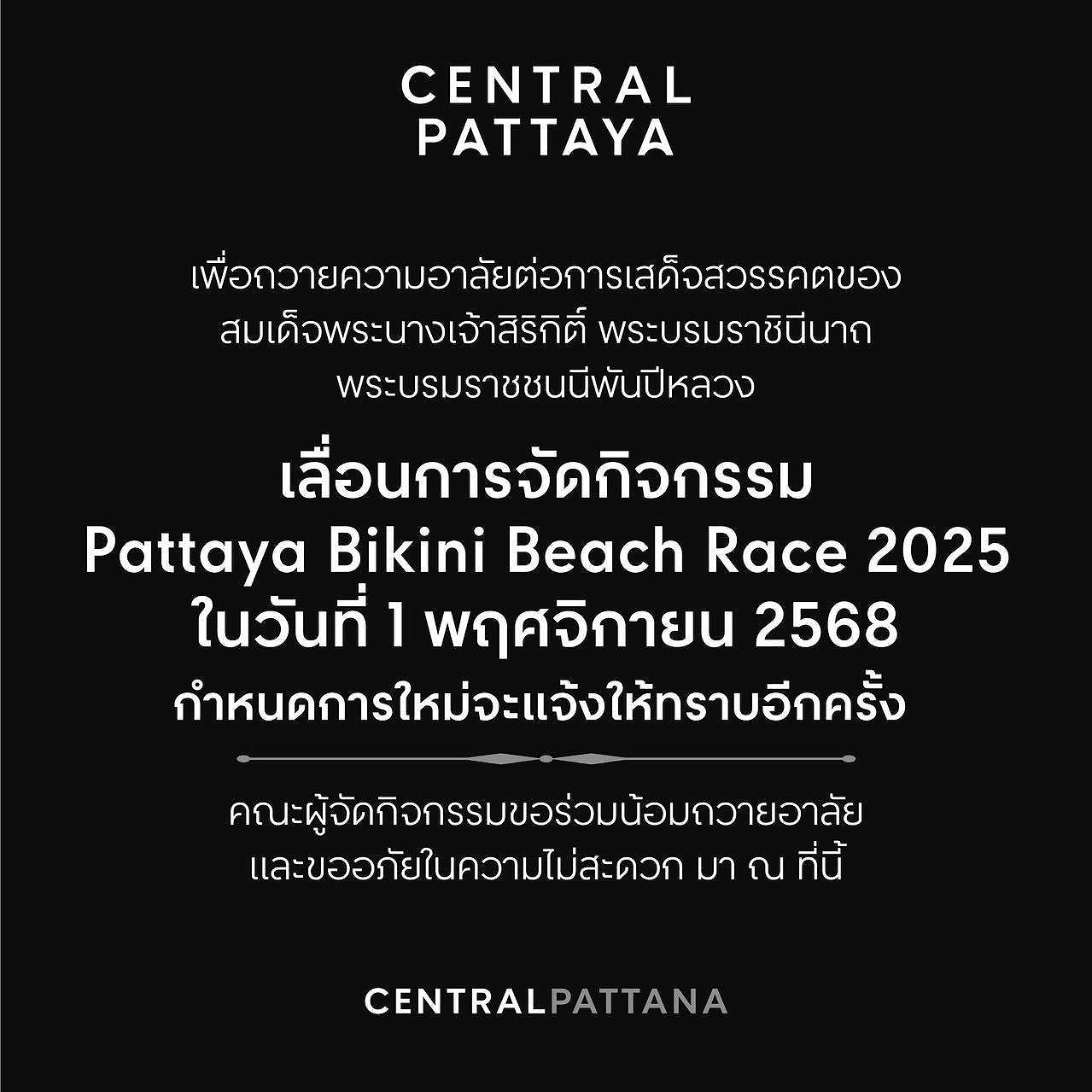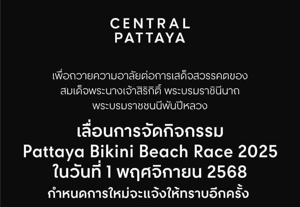セントラル・パタヤは、「シリキット王太后陛下のご崩御に際し、深い哀悼の意を表するため」として、2025年11月1日に開催を予定していた「Pattaya International Bikini Beach Race 2025」 の延期を発表しました。
