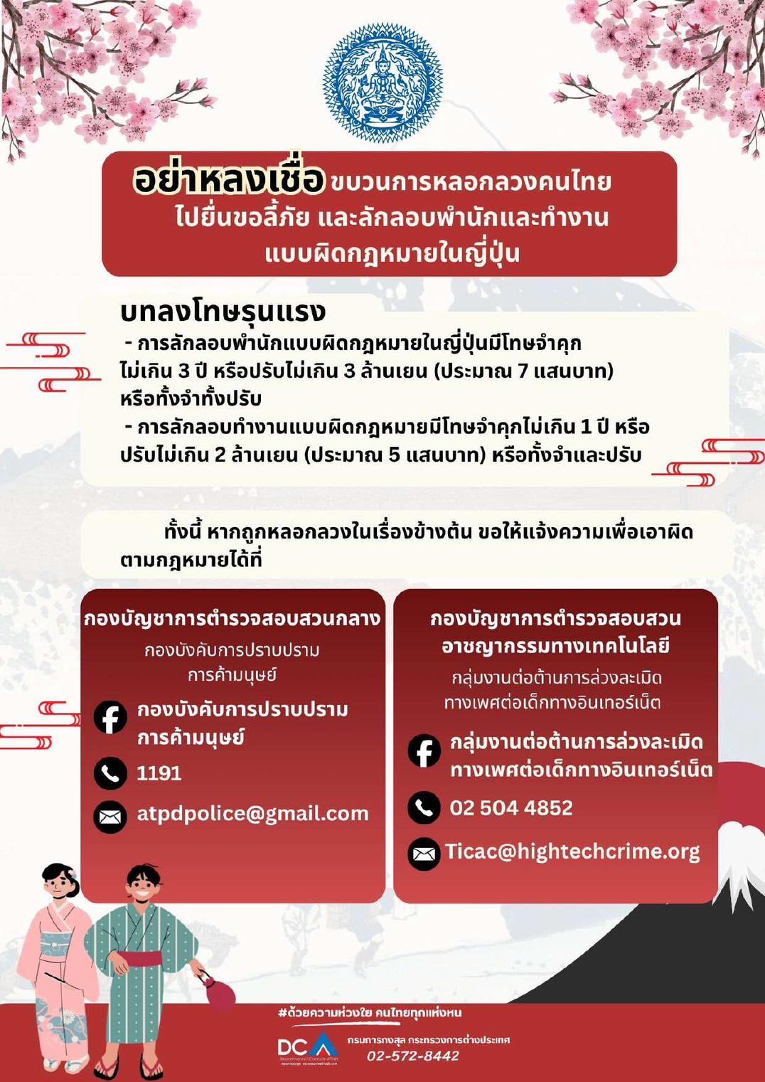 - タイ大使館、日本での「偽難民・就労詐欺」に注意呼びかけ。被害者でも最大3年の懲役刑に。