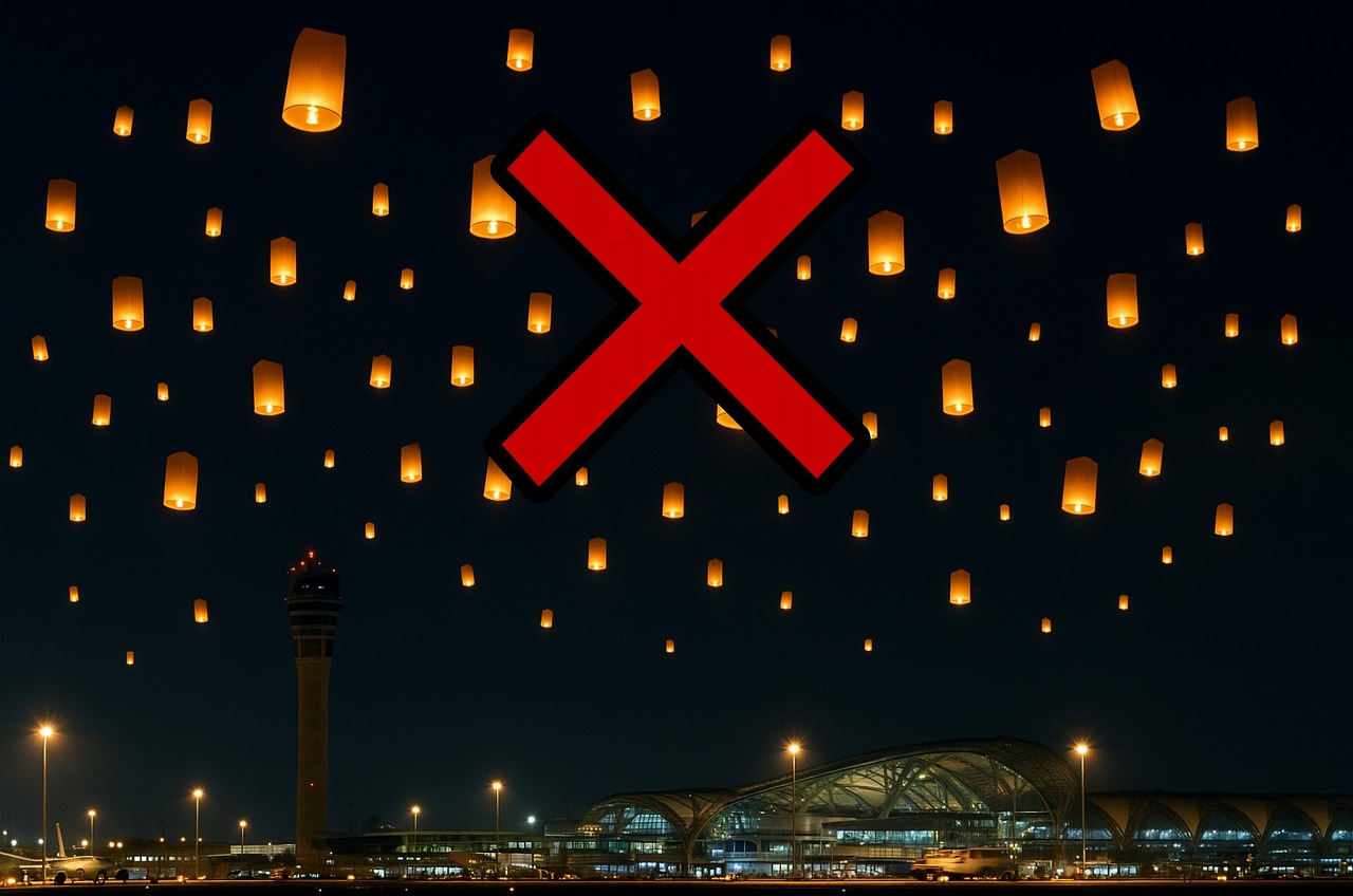 スワンナプーム空港は、2025年11月5日のロイクラトン祭りの期間中、航空安全確保のため、政府機関、企業、住民に対し、ランタン、花火、風船、レーザーライトの使用を控えるよう協力を呼びかけています。
