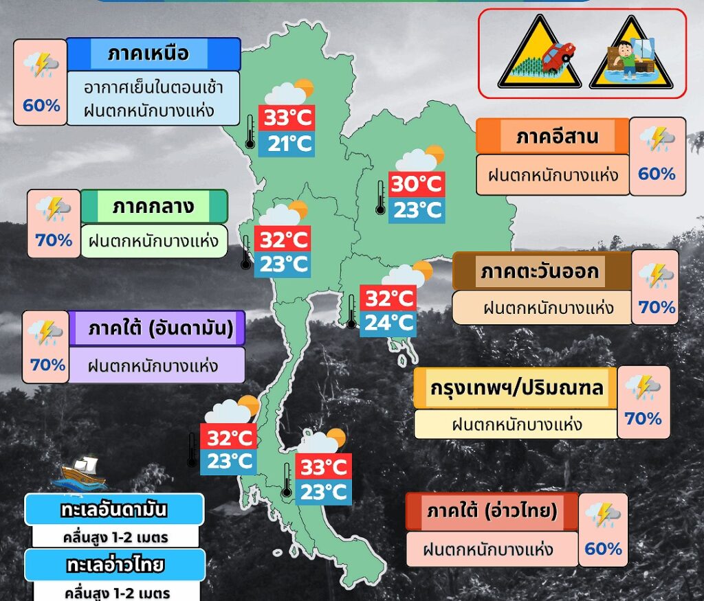 11月1日、タイ気象局は24時間以内の天気予報を発表し、全国的に強い雨が降る地域がある見込みだと警告しました。