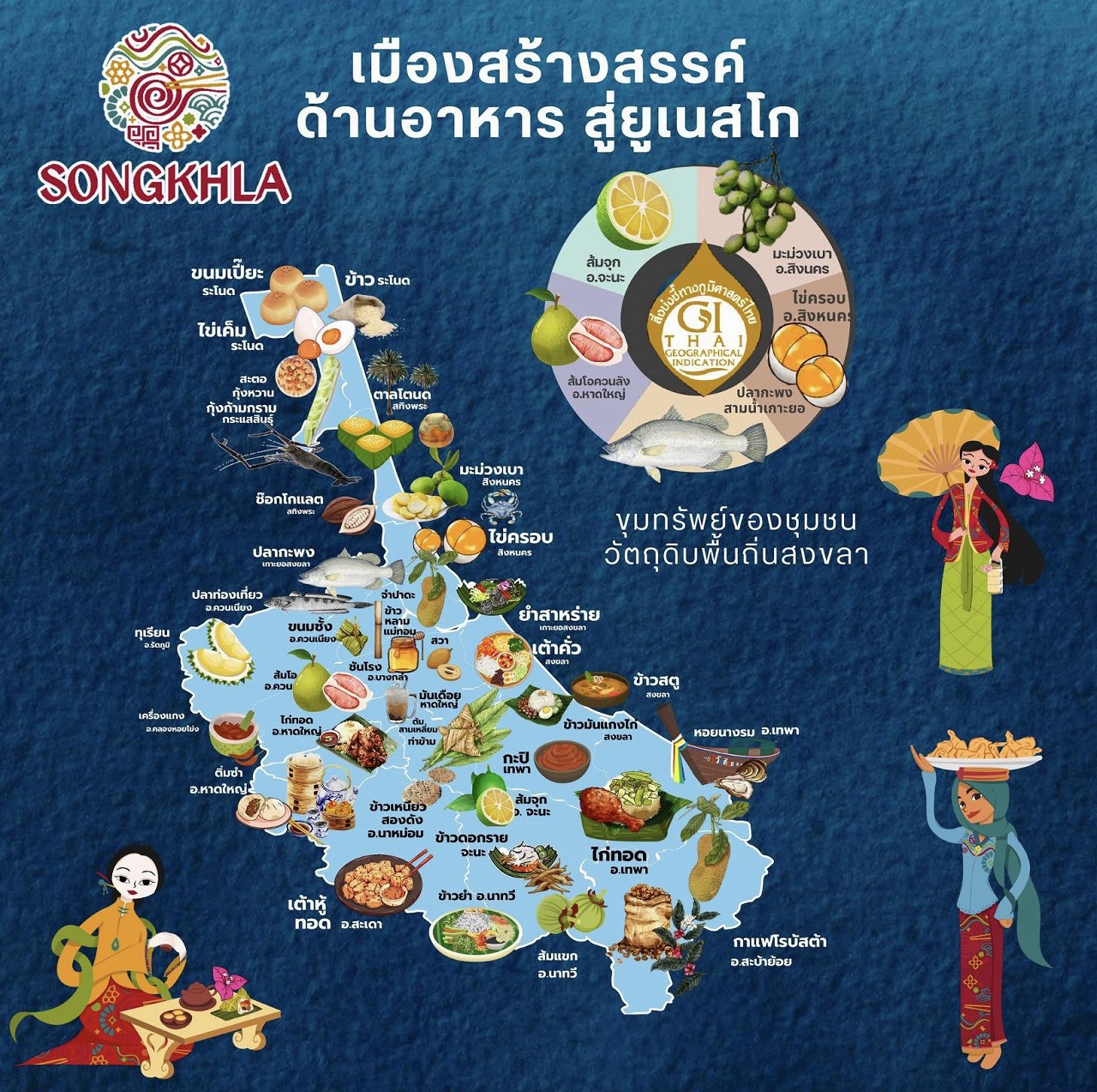 淡水・汽水・海水が共存するソンクラー湖と、タイランド湾に囲まれた地域は、「ノード・ナ・レー(โหนด นา-เล)」(砂糖ヤシ・水田・海)と呼ばれる生態系を形成し、多様な地元食材を生み出している。