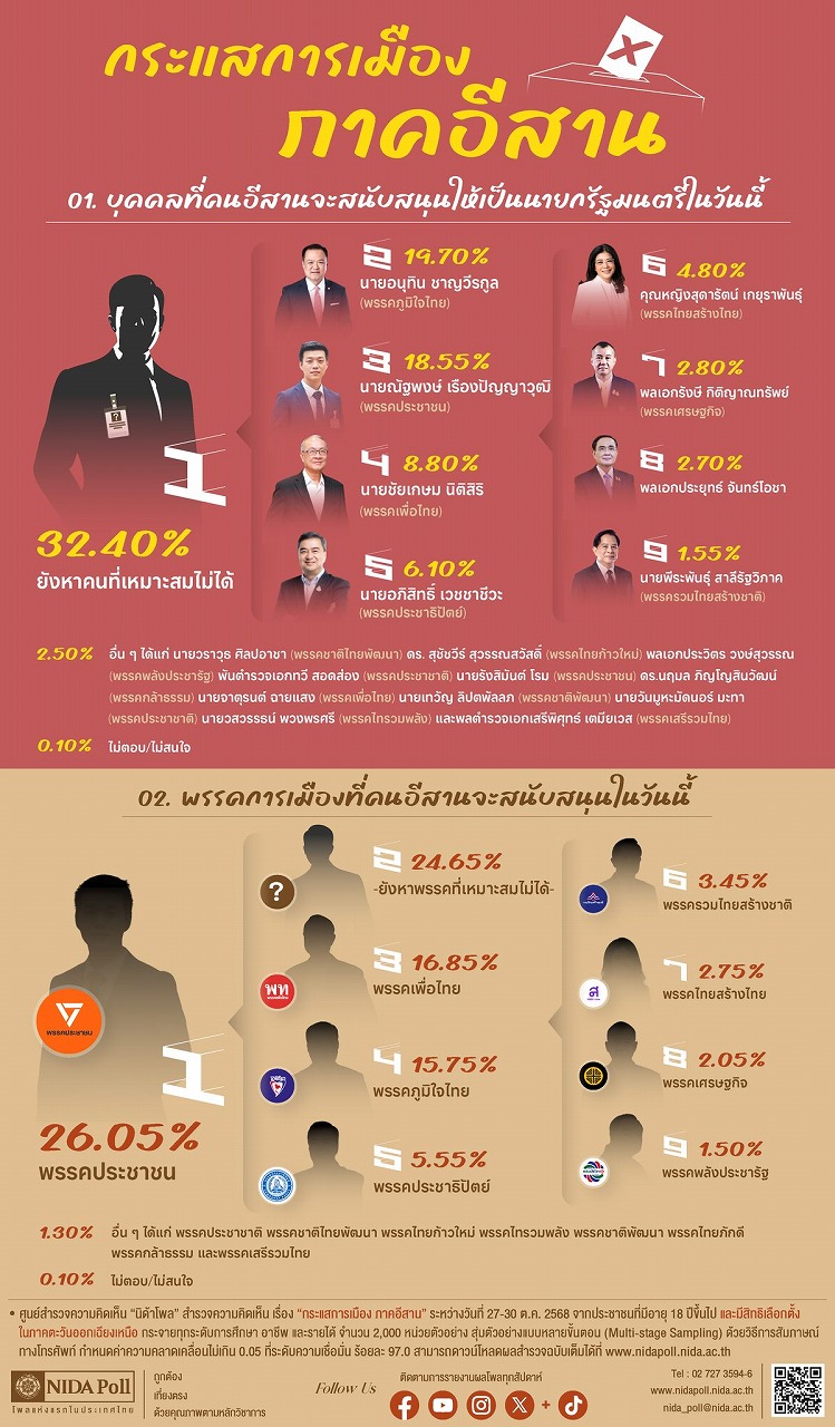 11月2日、国立開発行政研究院 NIDA Poll 世論調査センターは、「イサーン地方の政治情勢」に関する調査結果を発表しました。