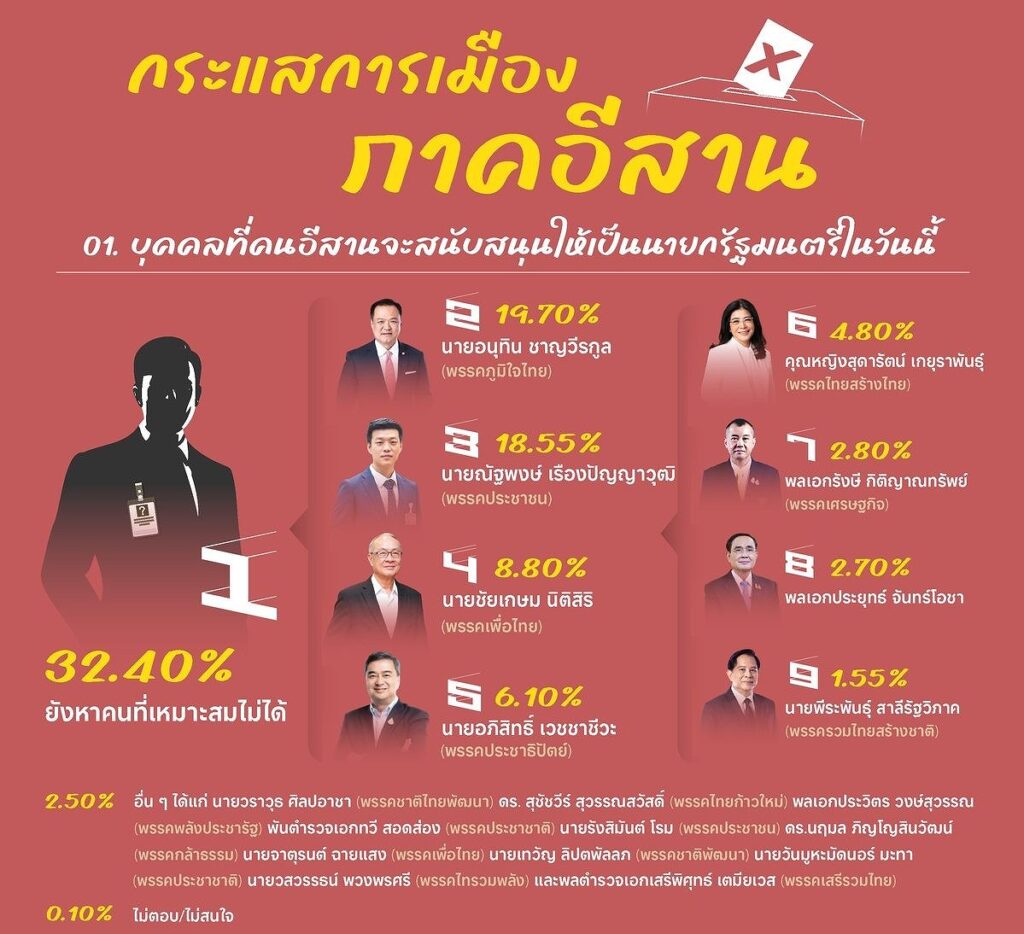 - イサーン地方世論調査:次期首相『適任者いない』が最多、政党支持は国民党が首位。
