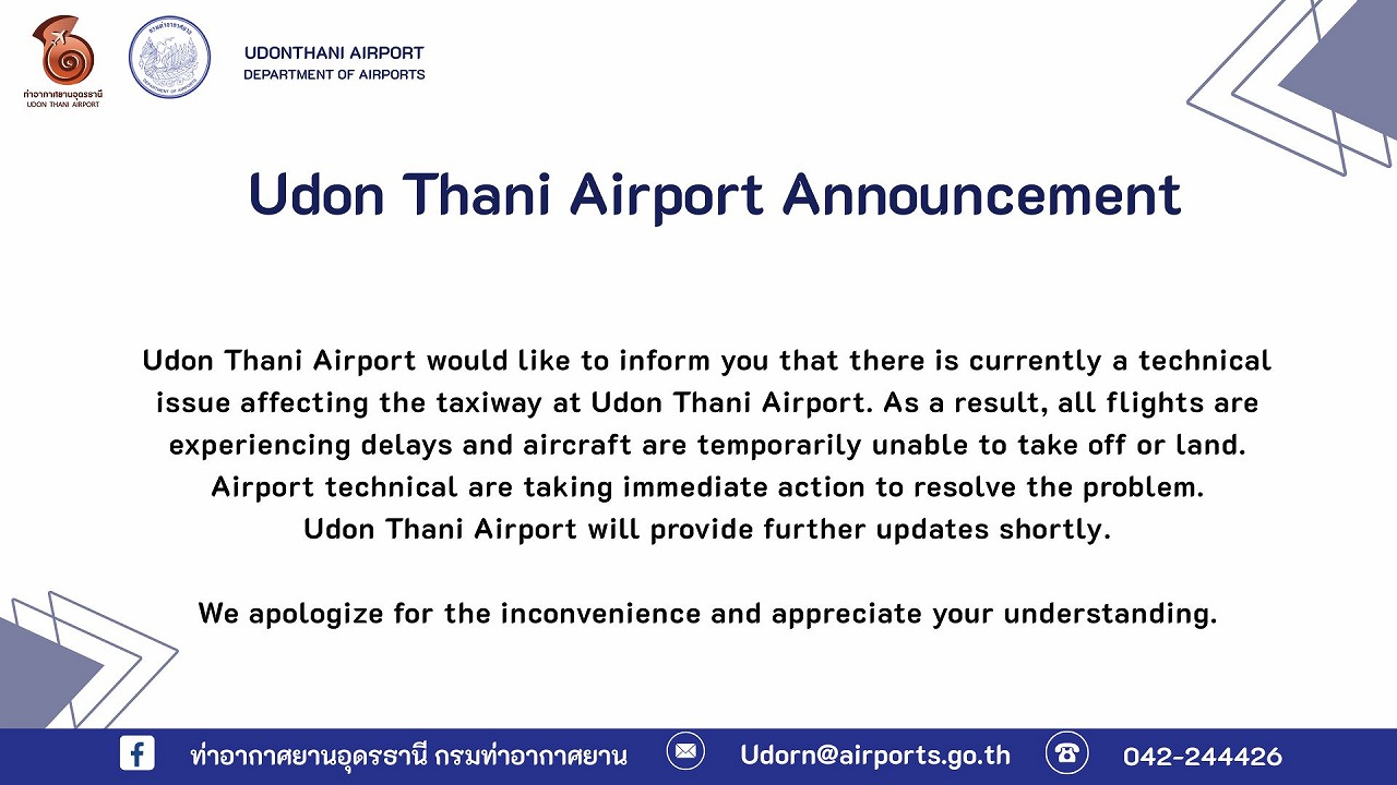 11月2日夜、ウドンタニー空港で電力システムの技術的障害が発生し、すべての便が一時的に離着陸不能となりました。