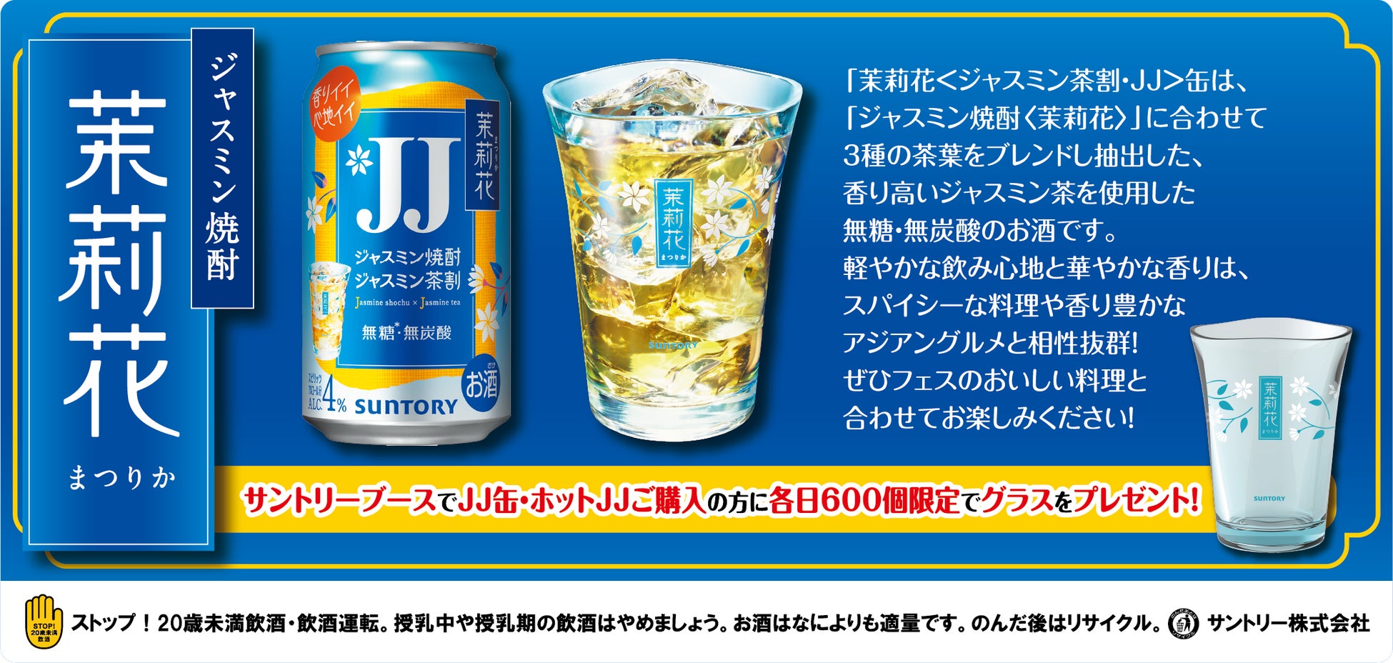 さらに、会場のサントリーブースでJJ缶・ホットJJをご購入の方には先着で「茉莉花グラス」のプレゼントや、9日(日)に開催される「サントリースペシャルステージ」でも“素敵なプレゼント”をご用意しております!