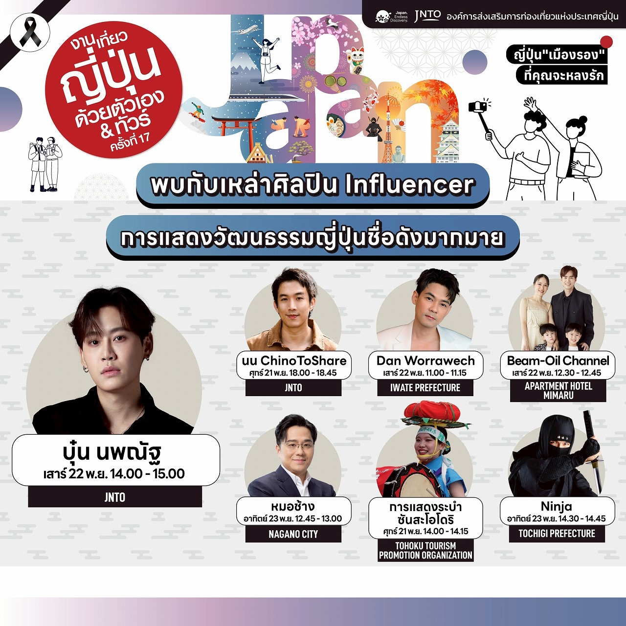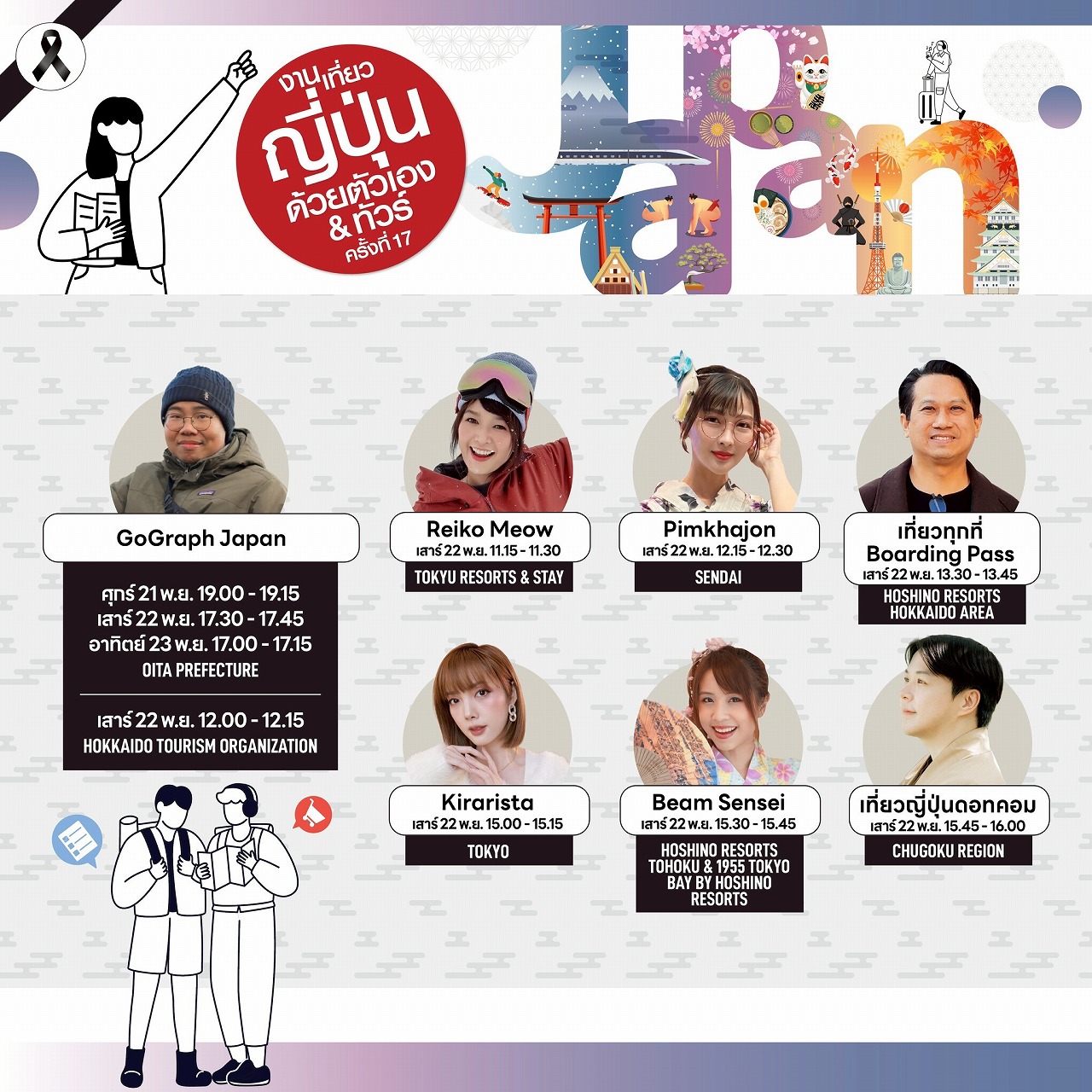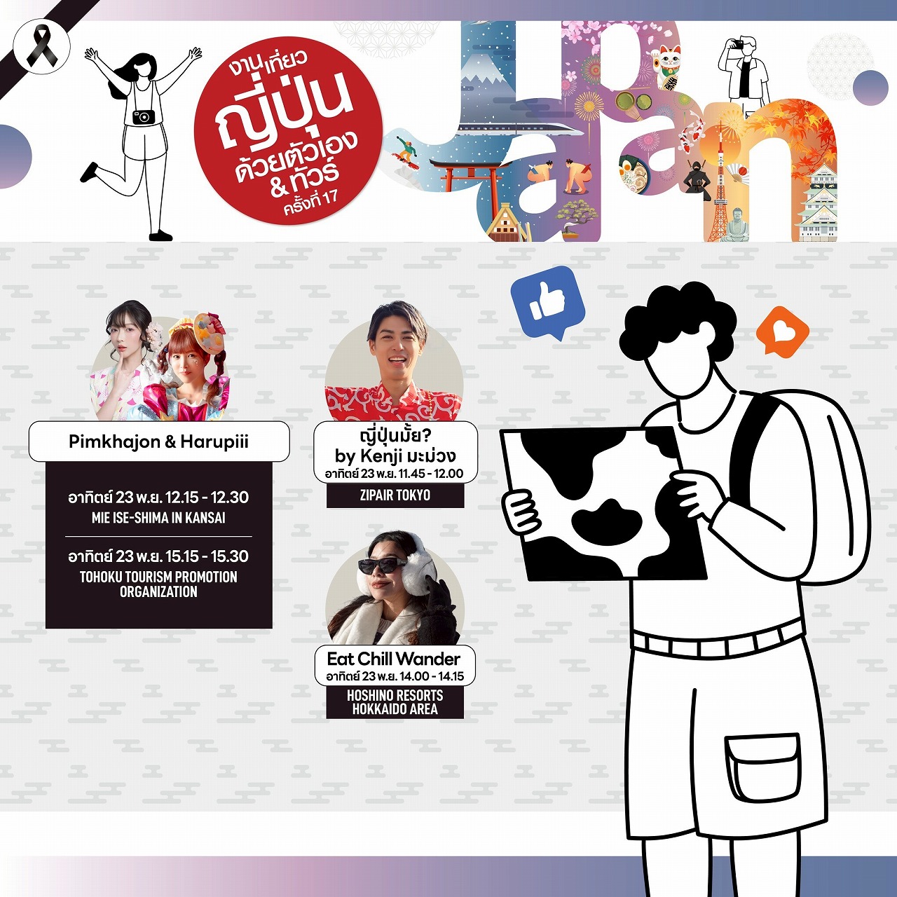 JNTO幹部および大鷹正人駐タイ日本大使による開会式の後、人気クリエイター「ノン・シノロット(นน ชิโนรส)」、そして「Go!Graph Japan」ページ管理人の「エットオン(แอดอ้น)」らが登壇し、“地方の日本”をテーマにした温かく楽しいトークを展開します。