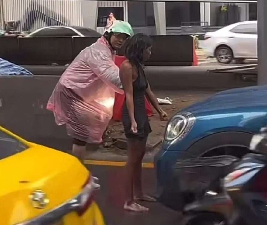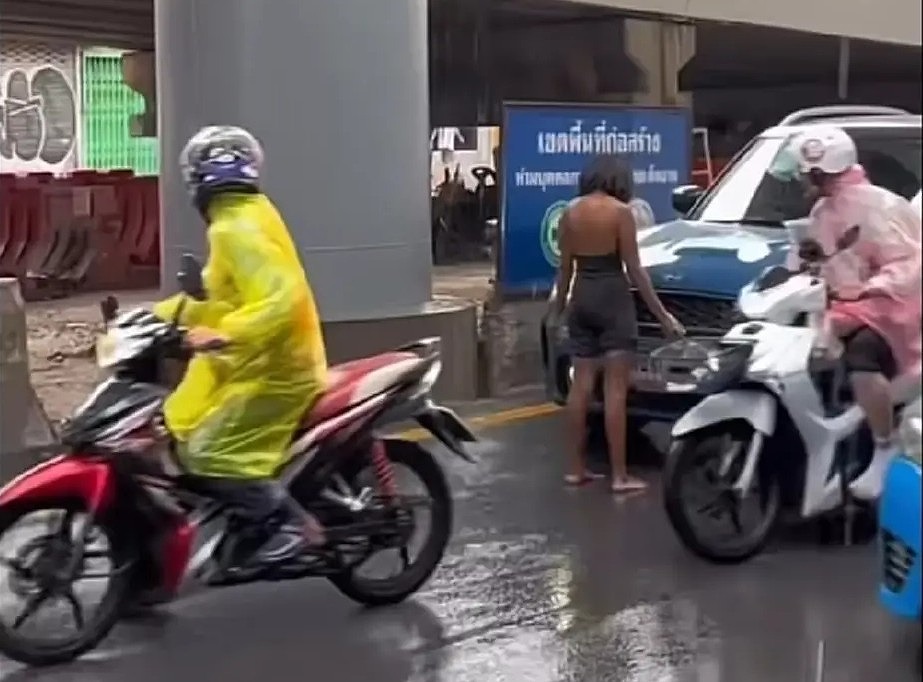 動画には、黒い服を着た女性がアソーク=ラマ9交差点の真ん中で、白いミニクーパーの前に立ちふさがり、まったく動こうとしない様子が映っている。