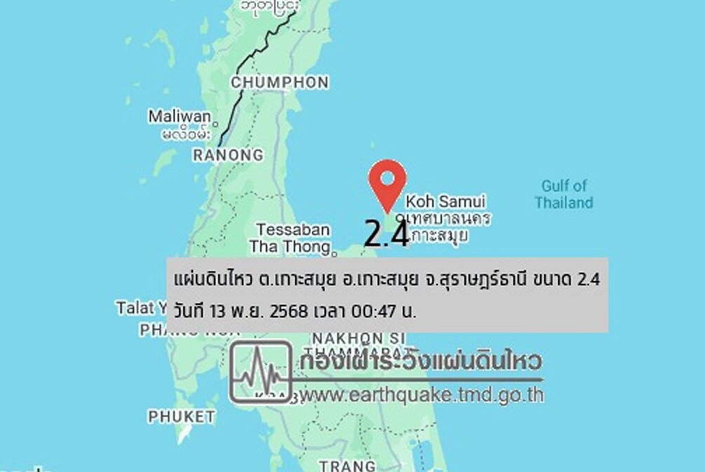 11月13日午前0時47分、タイ気象局地震監視センターの発表によると、スラータニー県サムイ島地区でマグニチュード2.4、深さ4キロメートルの地震が発生しました。