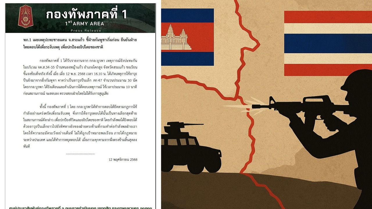 11月12日、タイ陸軍第1管区は、サケーオ県バーンノーンヤーケーオ地区の国境検問所S.34–35付近で発生した銃撃戦について、声明を発表した。