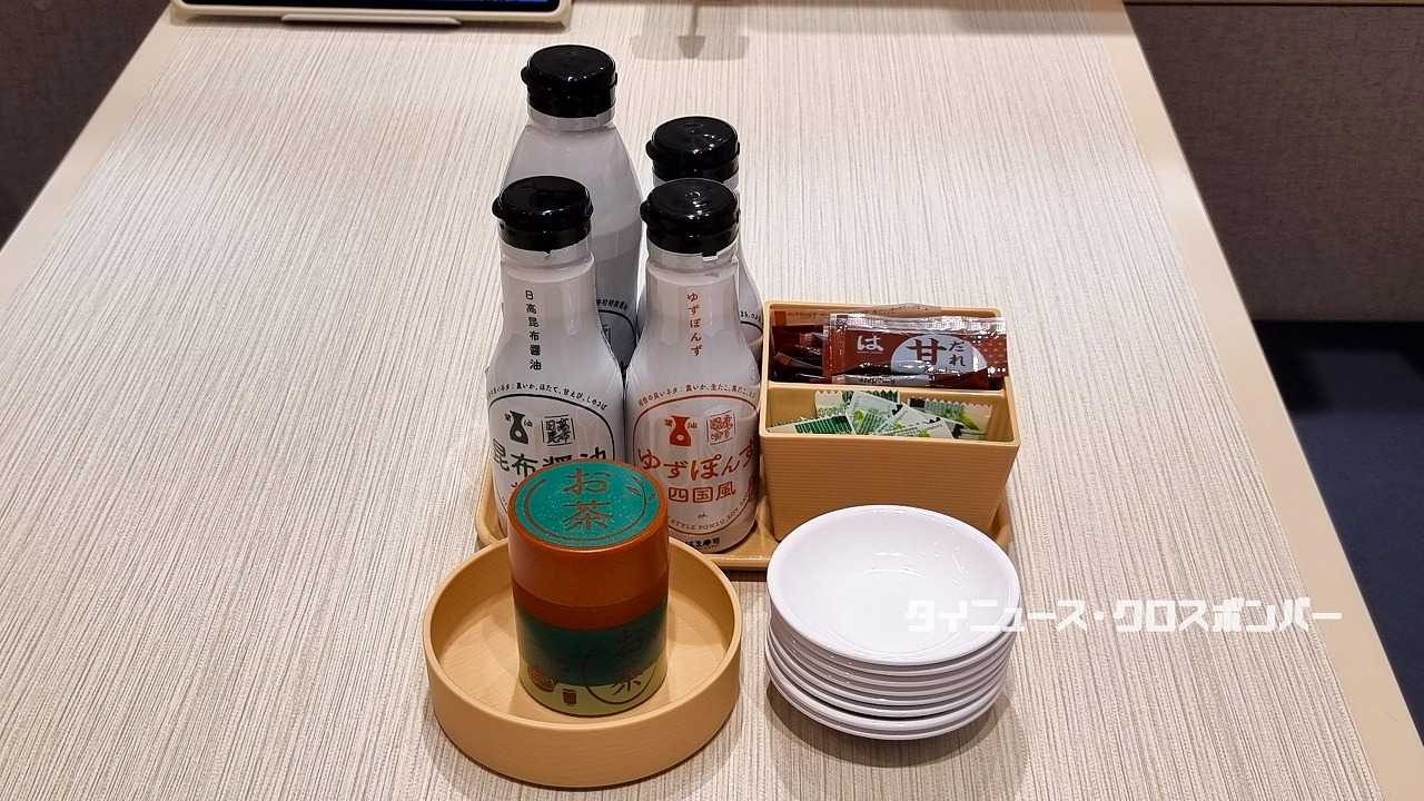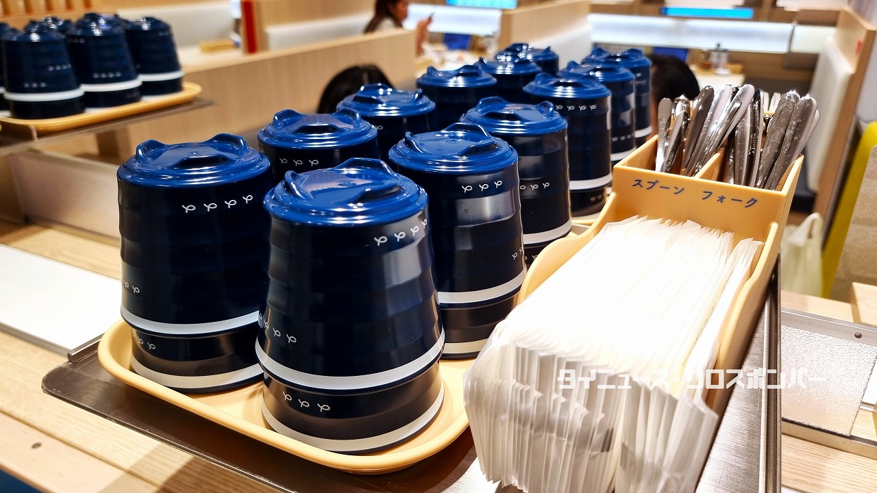湯呑やお手拭き、スプーンにフォークは、レーンの上にたっぷりとご用意。
