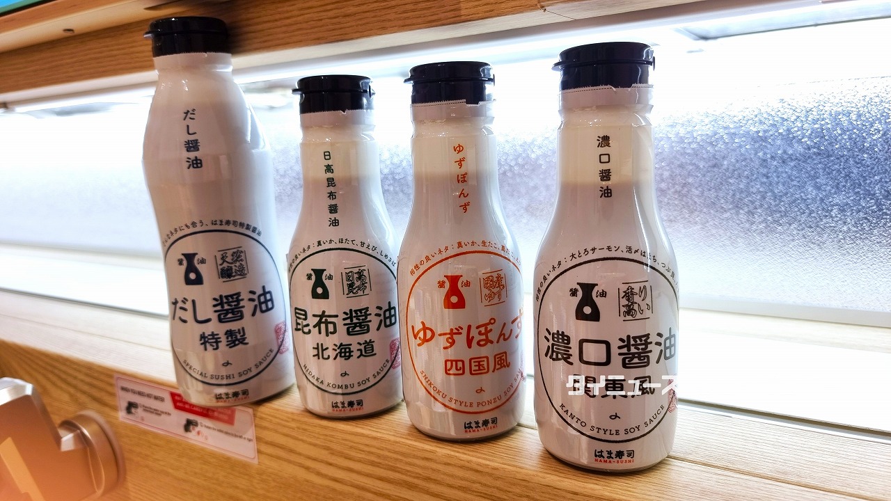 「はま寿司」では、デフォルトでテーブルの上にオリジナルブレンドの醤油が4種、用意されている。