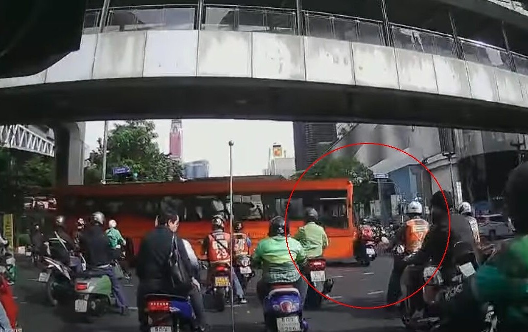 現場の映像によると、他のバイクが青信号で発進を始めた際、オレンジ色のバスが左側の交差点から突っ込んできた。