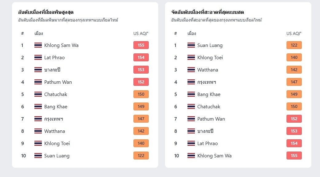 バンコクで汚染レベルが最も高い上位10地区(AQI)