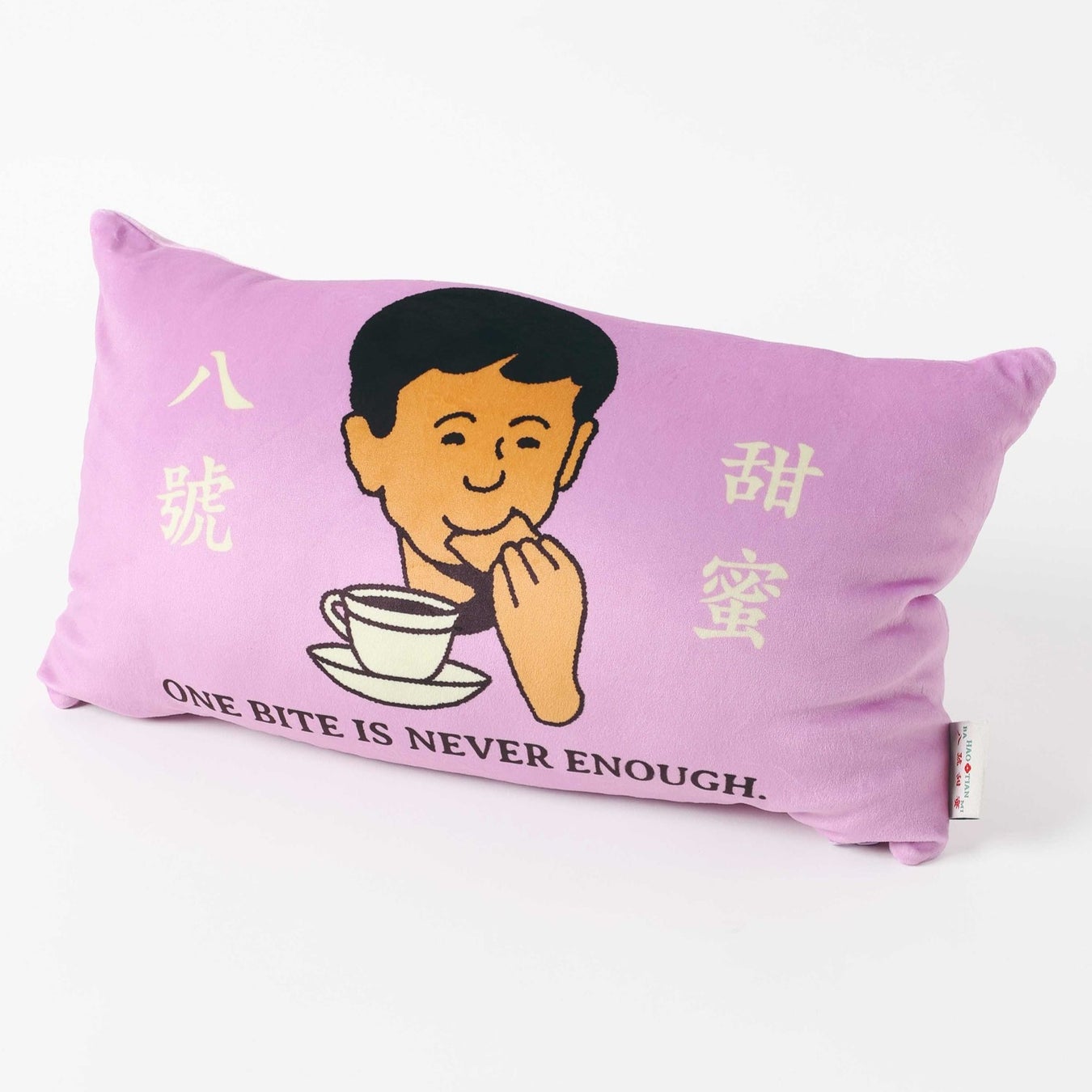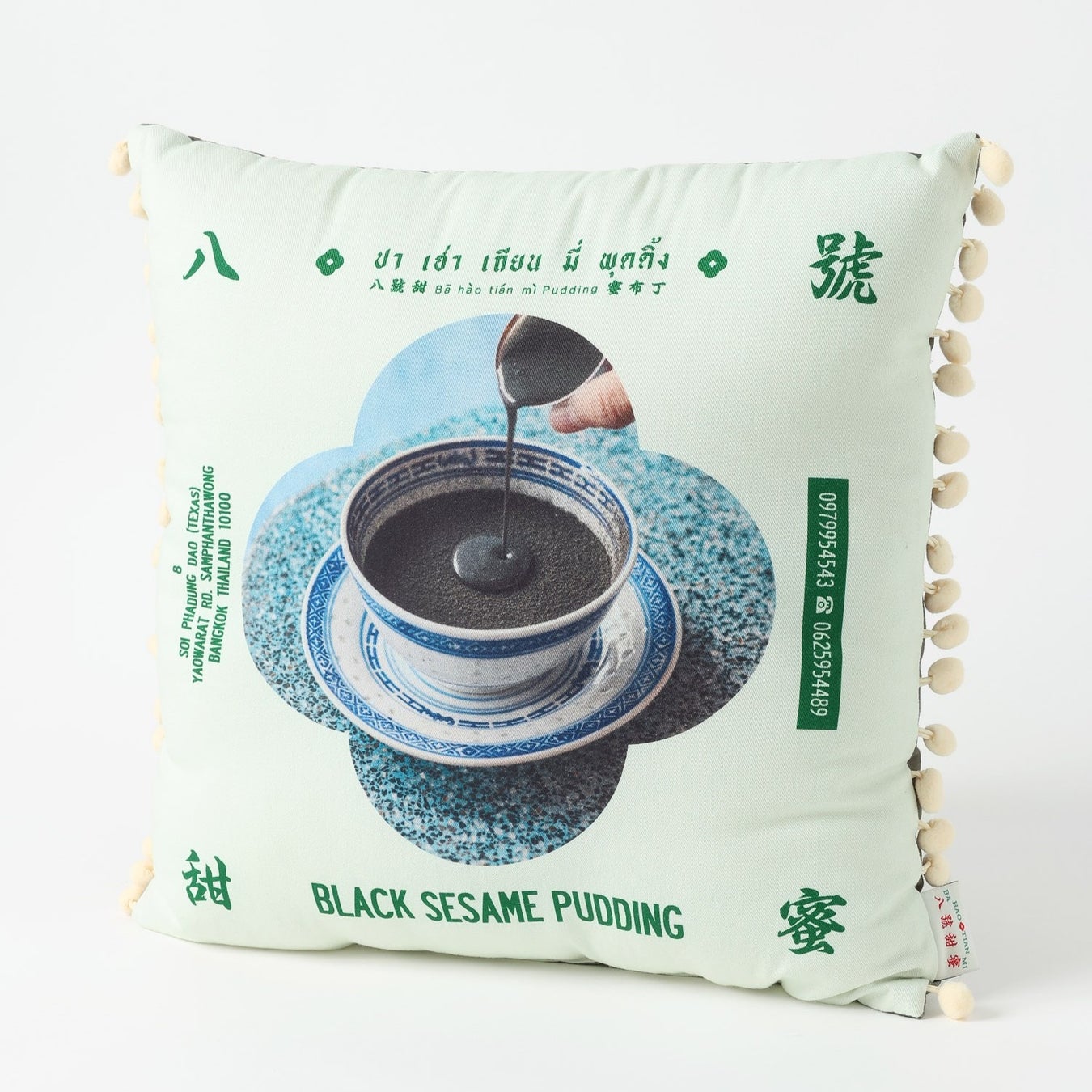 お店でも人気の黒ごまプリンを大きくプリントしたクッション。タイ文字・漢字・英文字を組み合わせたデザインが、中華街らしい雰囲気を演出します。左右にポンポンの飾りをあしらい、可愛さをプラス。ソファやベッドに置きやすい、正方形タイプでインテリアのアクセントにピッタリなアイテムです。