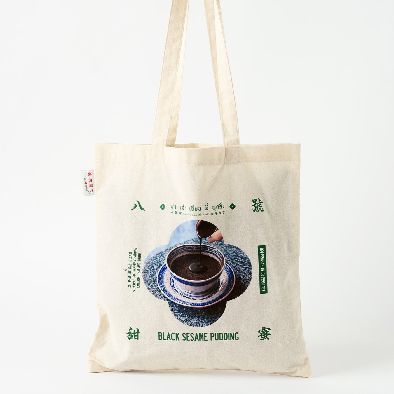 お店でも人気の黒ごまプリンをプリントしたトートバッグ。裏面は英文字のコンセプト文に漢字ロゴを合わせた、すっきりとしたデザインがポイントです。ゆったり肩に掛けられる長さの持ち手で、デイリーシーンでもラフに使えます。